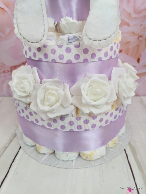 Tordi otsas on meie enda poolt hoole ja armastusega heegeldatud amigurumi jänes, keda me ise kutsume mässupüksiks, sest jänku on alles väike ja kannab mähkmeid. Mähkmetort ise on tehtud suhkrust ja jahust ja maasikavahust – nali, tegelikult ikka mähkmetest.