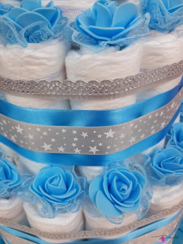 Õrn, helesinine mähkmetort, mis on üks meie traditsioonilisemaid mähkmetorte. Tort sisaldab lisaks mähkmetele ka lutiketti, mis on soovi korral võimalik ka nimelisena meisterdada.