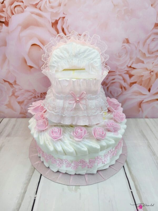 Armas väike roosa mähkmetort, mis sisaldab lisaks mähkmetele ka nimelist (või soovi korral ilma nimeta) lutiketti.