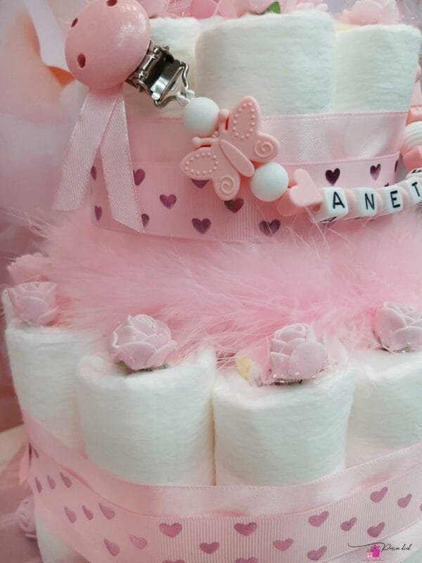 See mähkmetort on õrn, beebilik, nunnu, tagasihoidlik, aga samas mitte liiga tagasihoidlik. Parajalt roosamanna mähkmetort ühele pisikesele beebile katsikukingituseks. Mähkmetort sisaldab lisaks mähkmetele ka lutiketti, mille võime soovi korral ka nimelisena meisterdada.