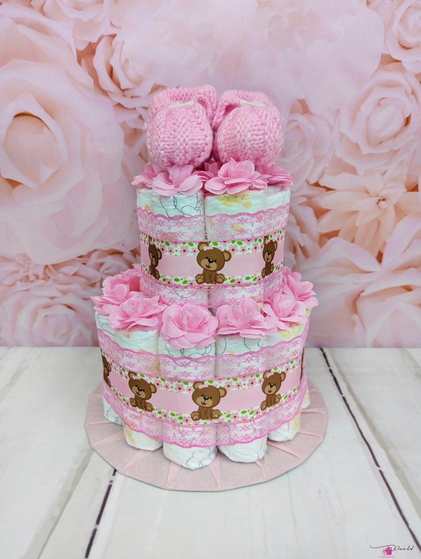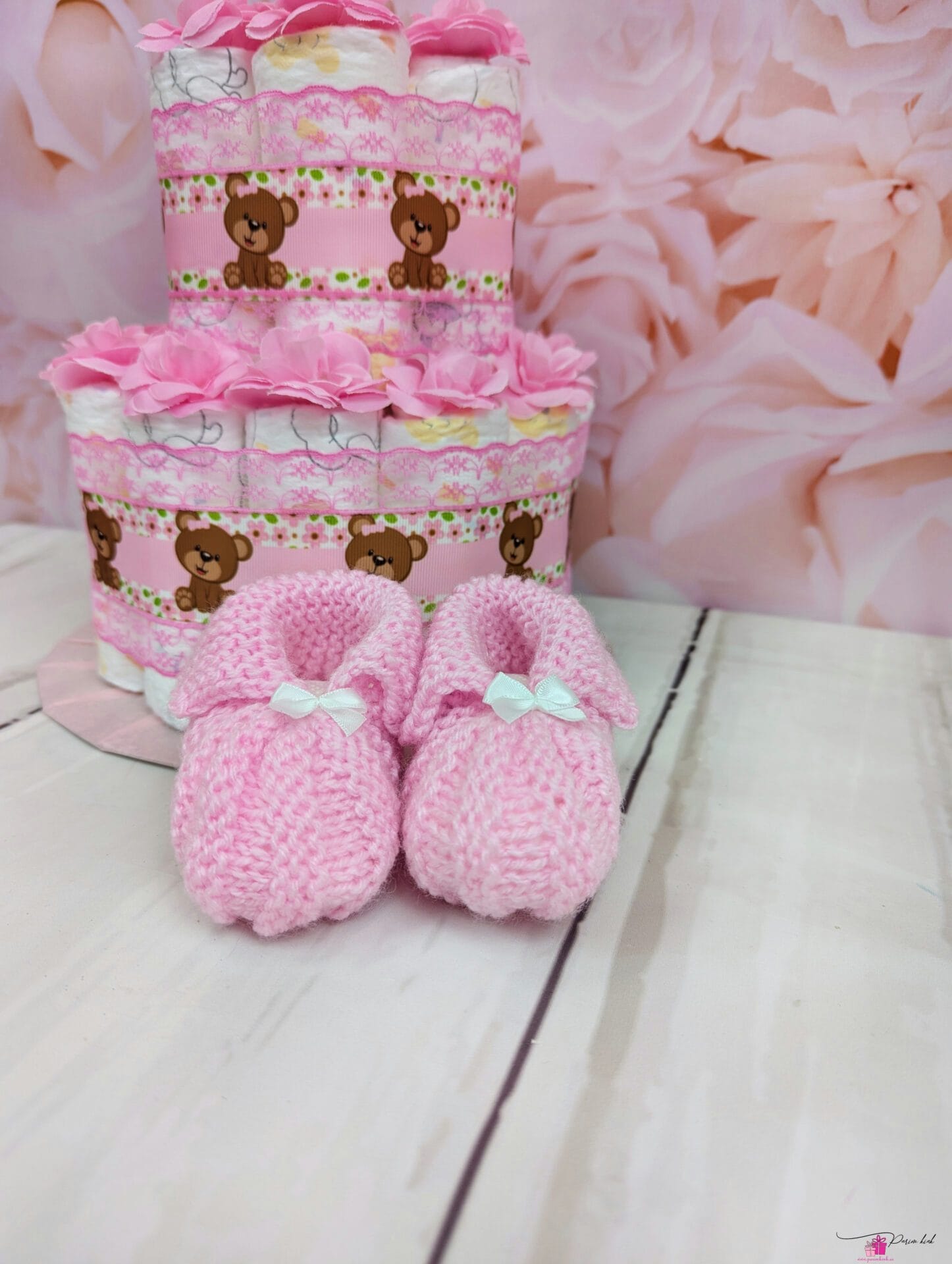 Mähkmetort mille otsas on meie enda käsitööna kootud beebipapud. Papude kinkimine katsikuks on juba väga vana komme. Ja mis saab olla parem kingitus, kui ühendada need 2 – tänapäevane mähketort ja traditsioonilised papud?