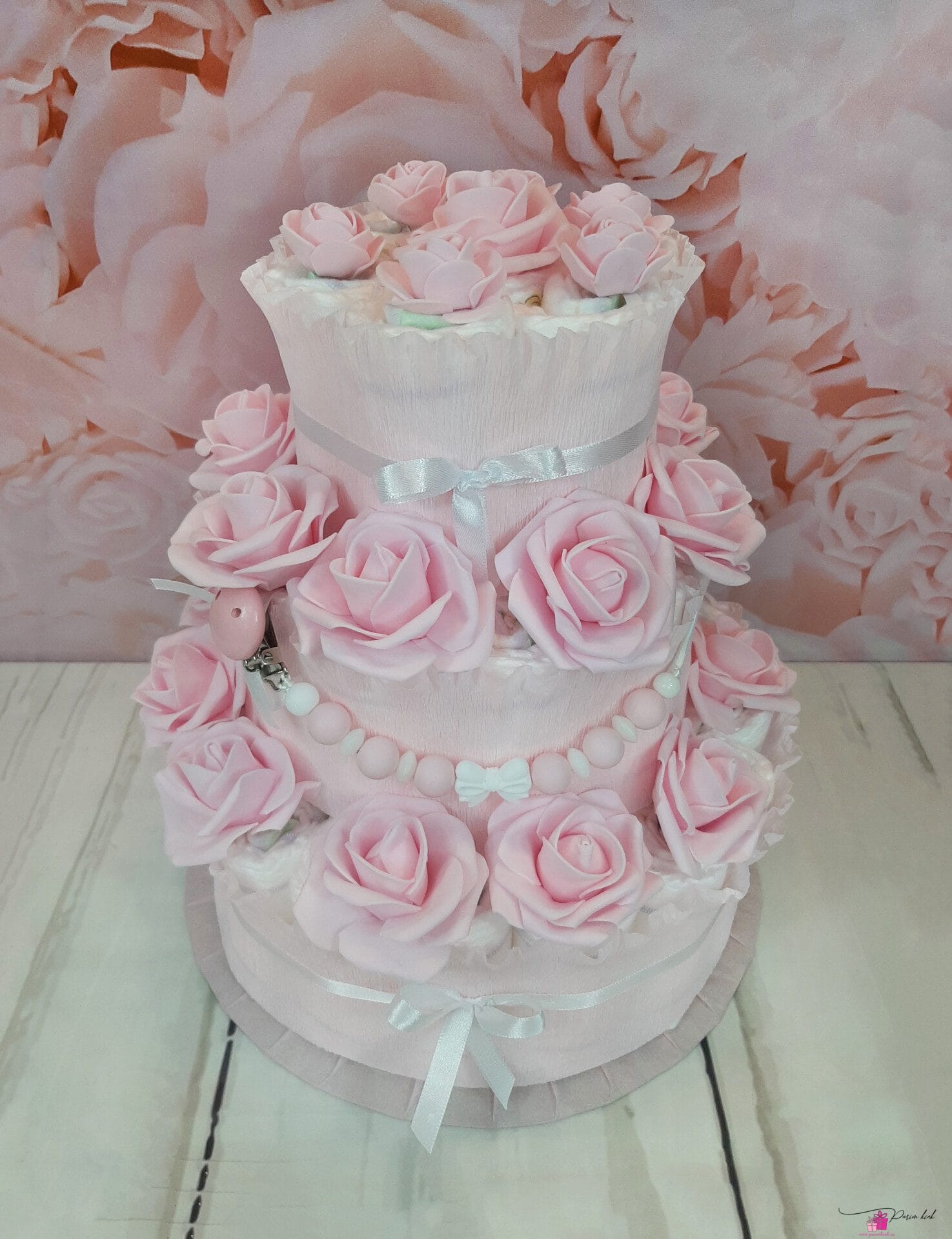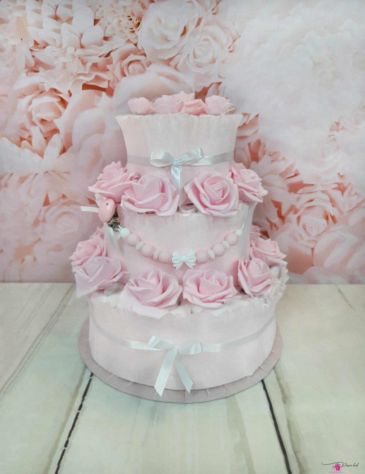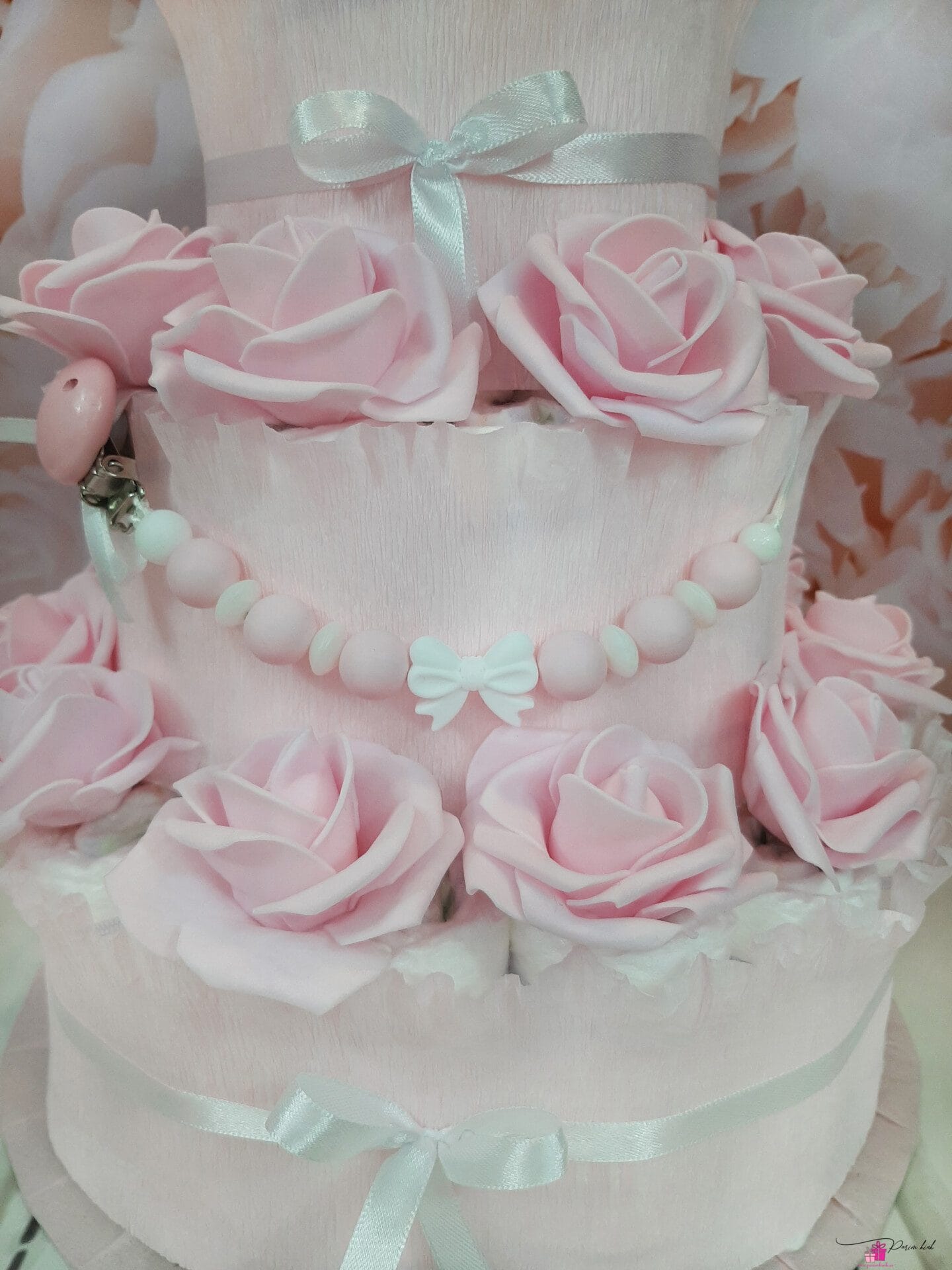See mähkmetort on õrn, beebilik, nunnu, tagasihoidlik, aga samas mitte liiga tagasihoidlik. Parajalt roosamanna mähkmetort ühele pisikesele beebile katsikukingituseks. Mähkmetort sisaldab lisaks mähkmetele ka lutiketti, mille võime soovi korral ka nimelisena meisterdada.