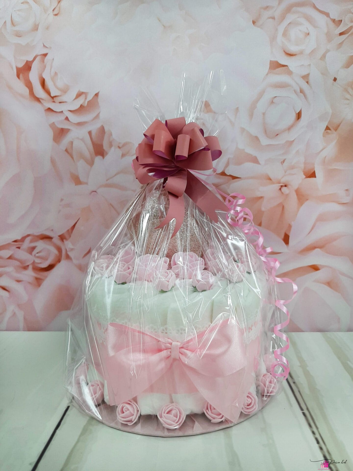 Mähkmetort on valmistatud 15-st mähkmest, pakitud tsellofaani ning kaunistatud suure rosetiga.