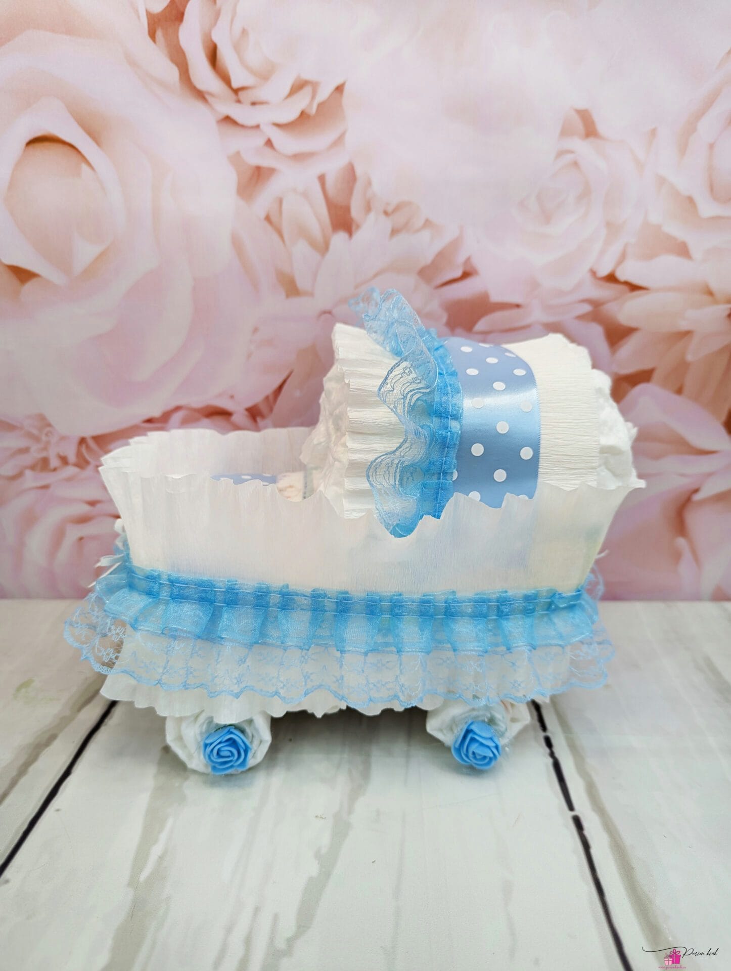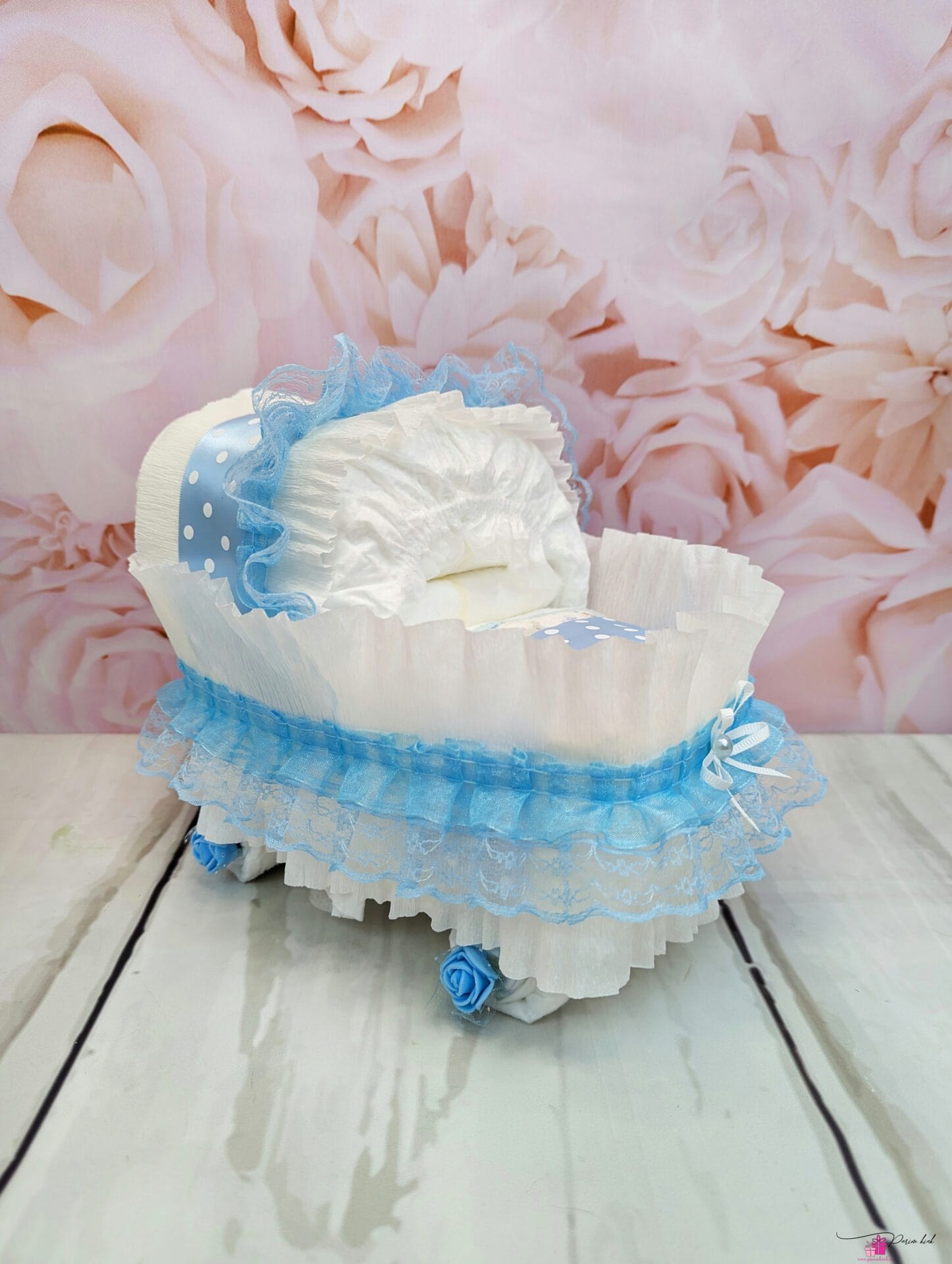 Mähkmetort on valmistatud 16-st mähkmest, pakitud tsellofaani ning kaunistatud suure rosetiga.