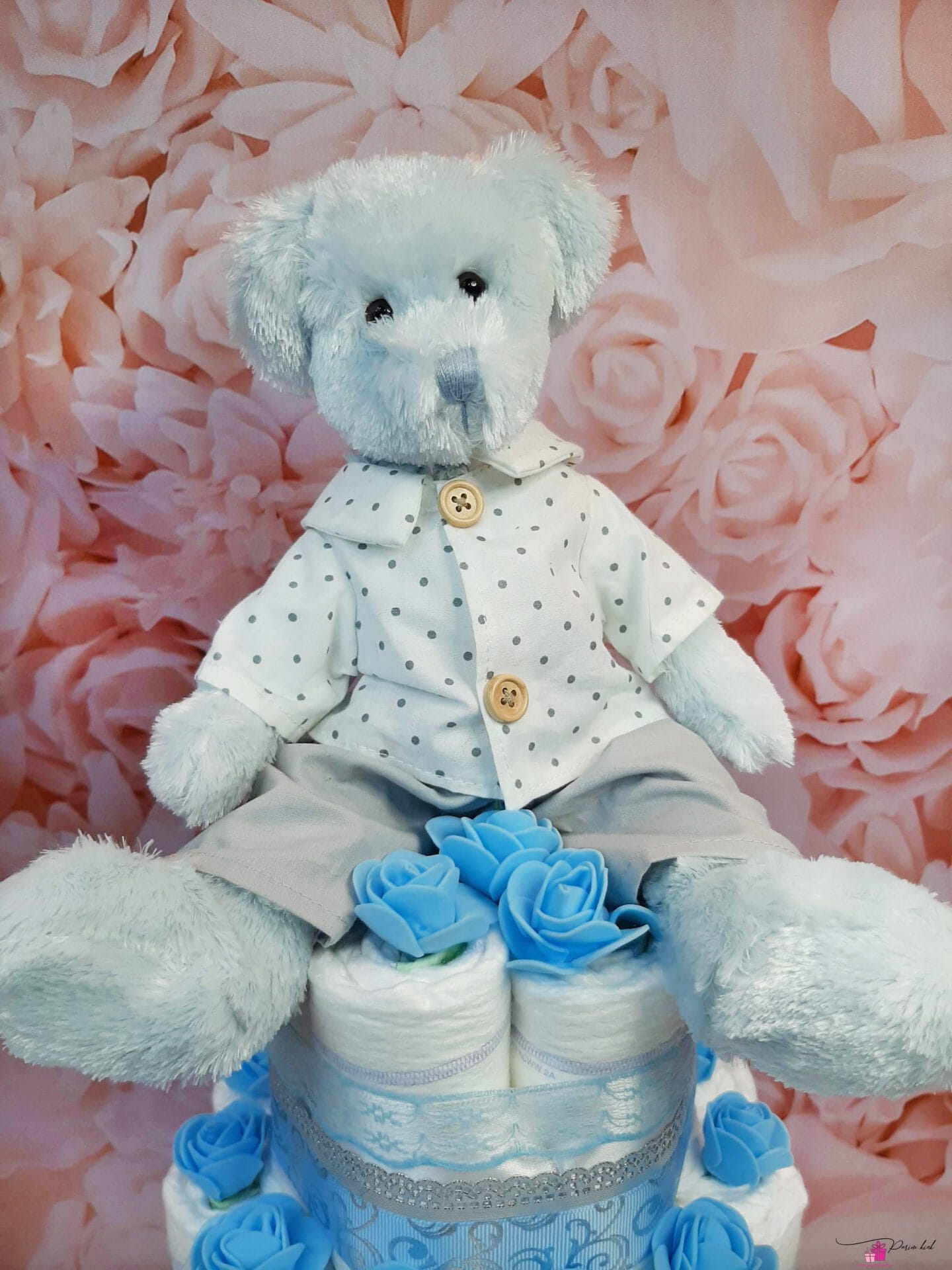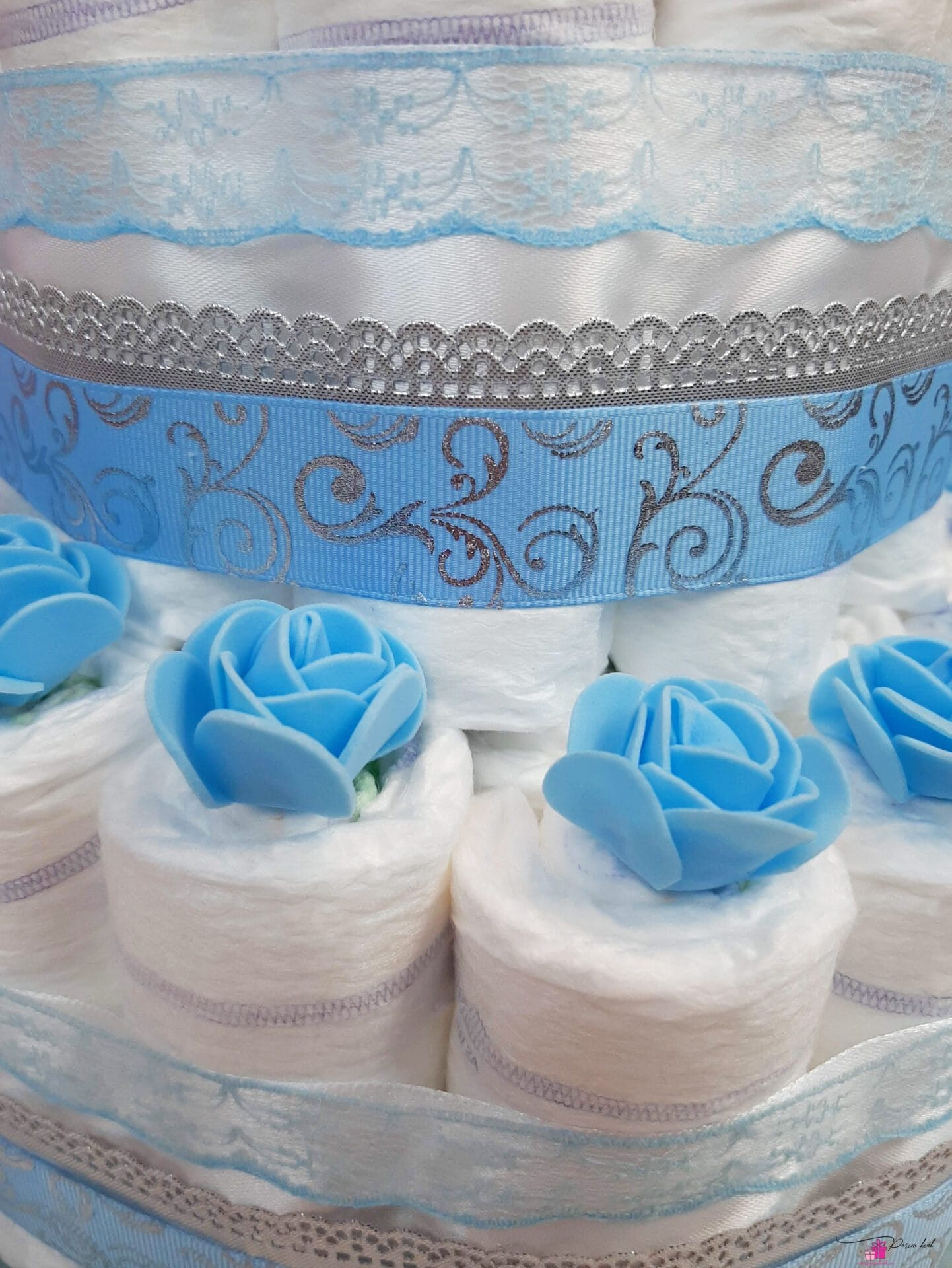 Mähkmetort on valmistatud 55-st mähkmest, pakitud tsellofaani ning kaunistatud suure rosetiga.