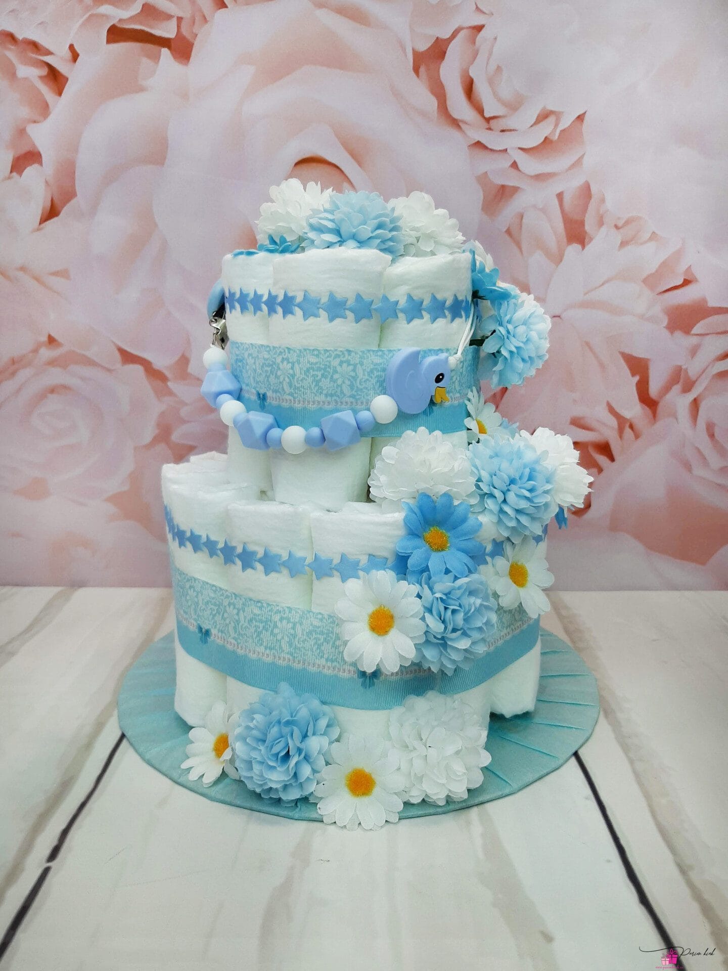 Tegu on täpselt parajas mõõdus tordiga, mille üle on iga värske lapsevanem kindlasti rõõmus! Lisaks mähkmetele sisaldab tort ka BPA vabast silikoonist lutiketti.