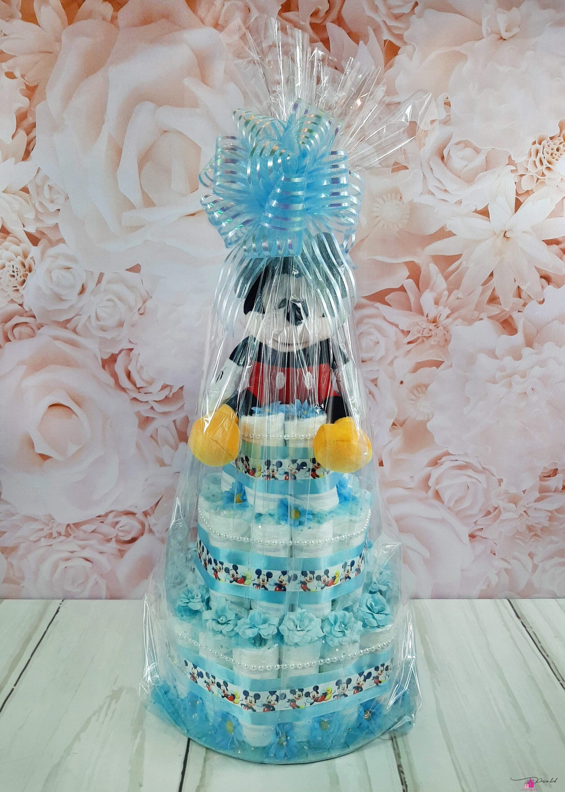 Mähkmetort on valmistatud 55-st mähkmest, pakitud tsellofaani ning kaunistatud suure rosetiga.