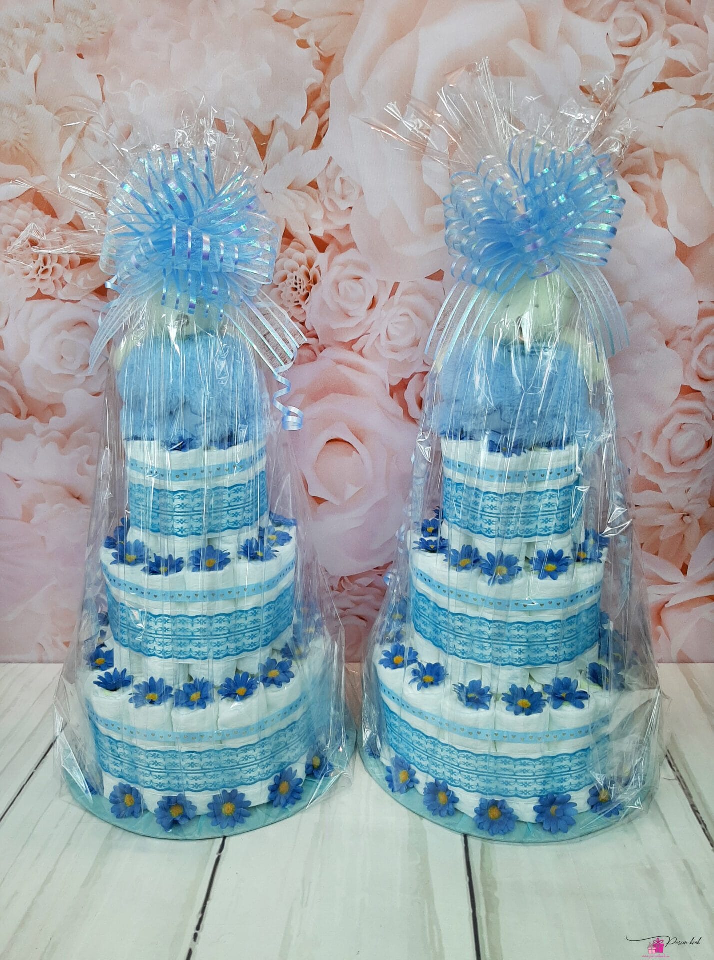 Mõlemad mähkmetordid on valmistatud 55-st mähkmest, pakitud tsellofaani ning kaunistatud suure rosetiga.