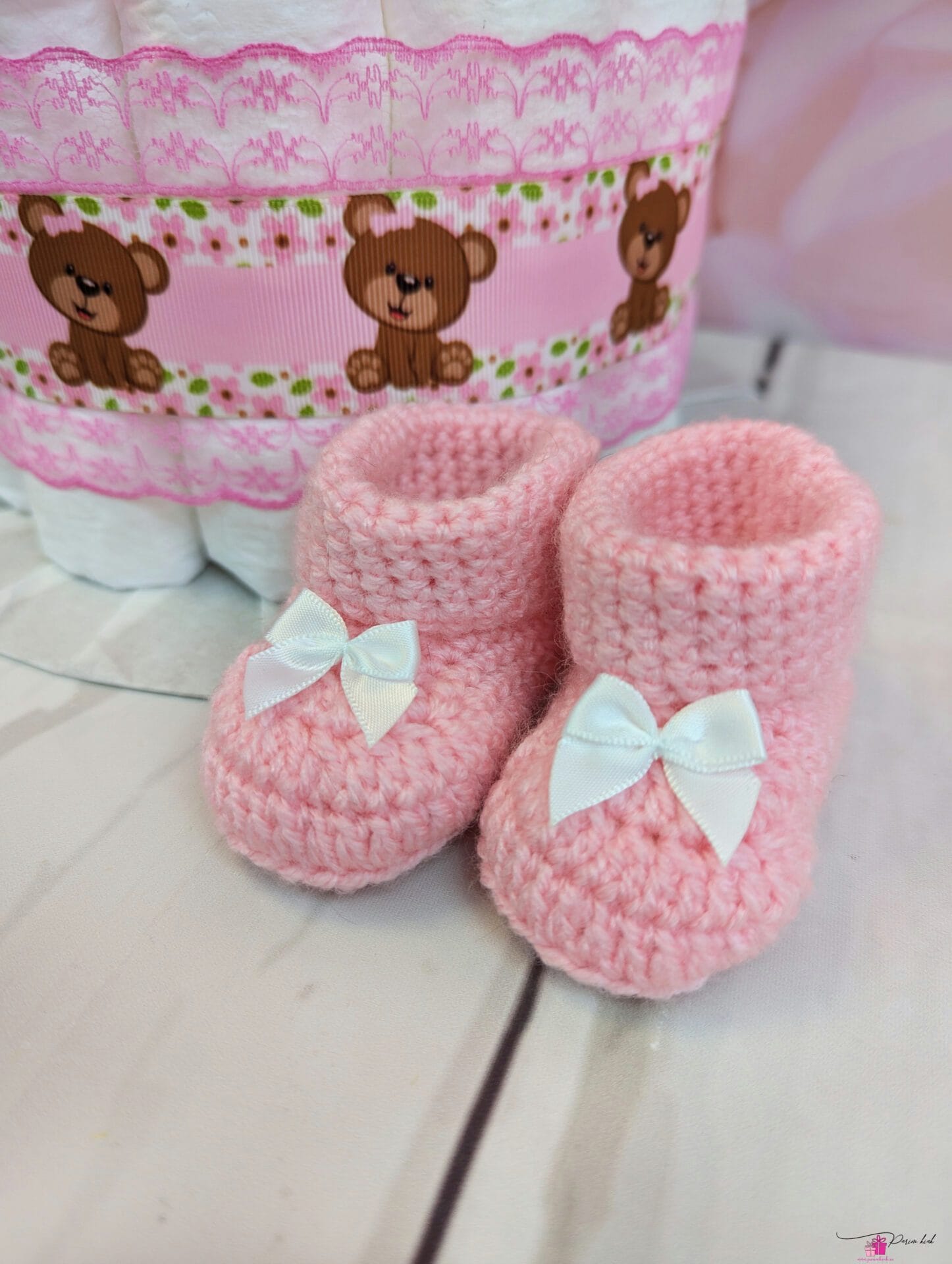 Mähkmetort mille otsas on meie enda käsitööna kootud beebipapud. Papude kinkimine katsikuks on juba väga vana komme. Ja mis saab olla parem kingitus, kui ühendada need 2 – tänapäevane mähketort ja traditsioonilised papud?