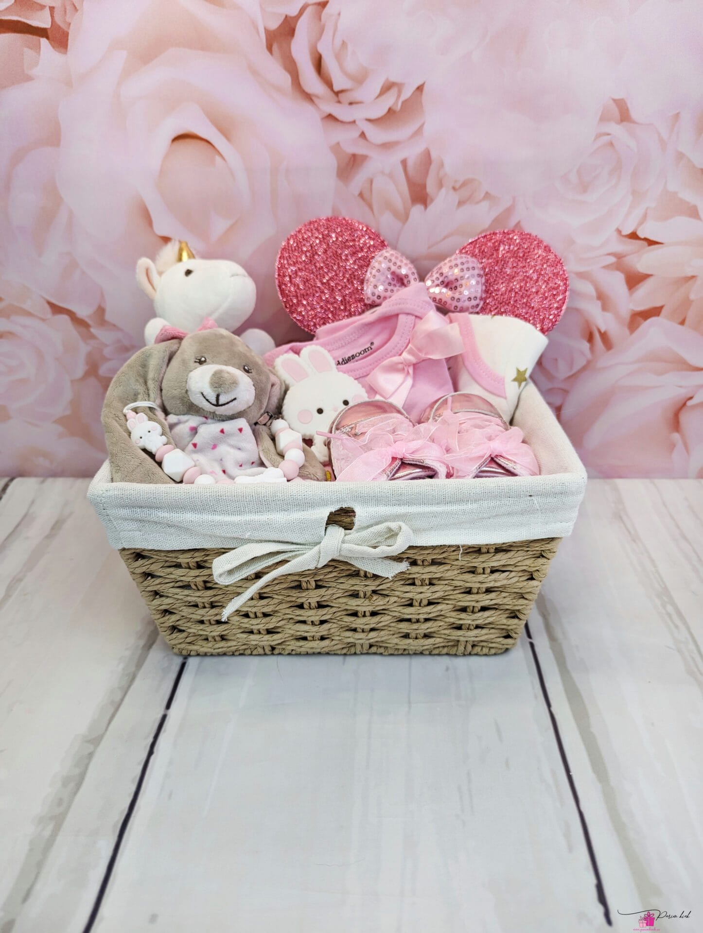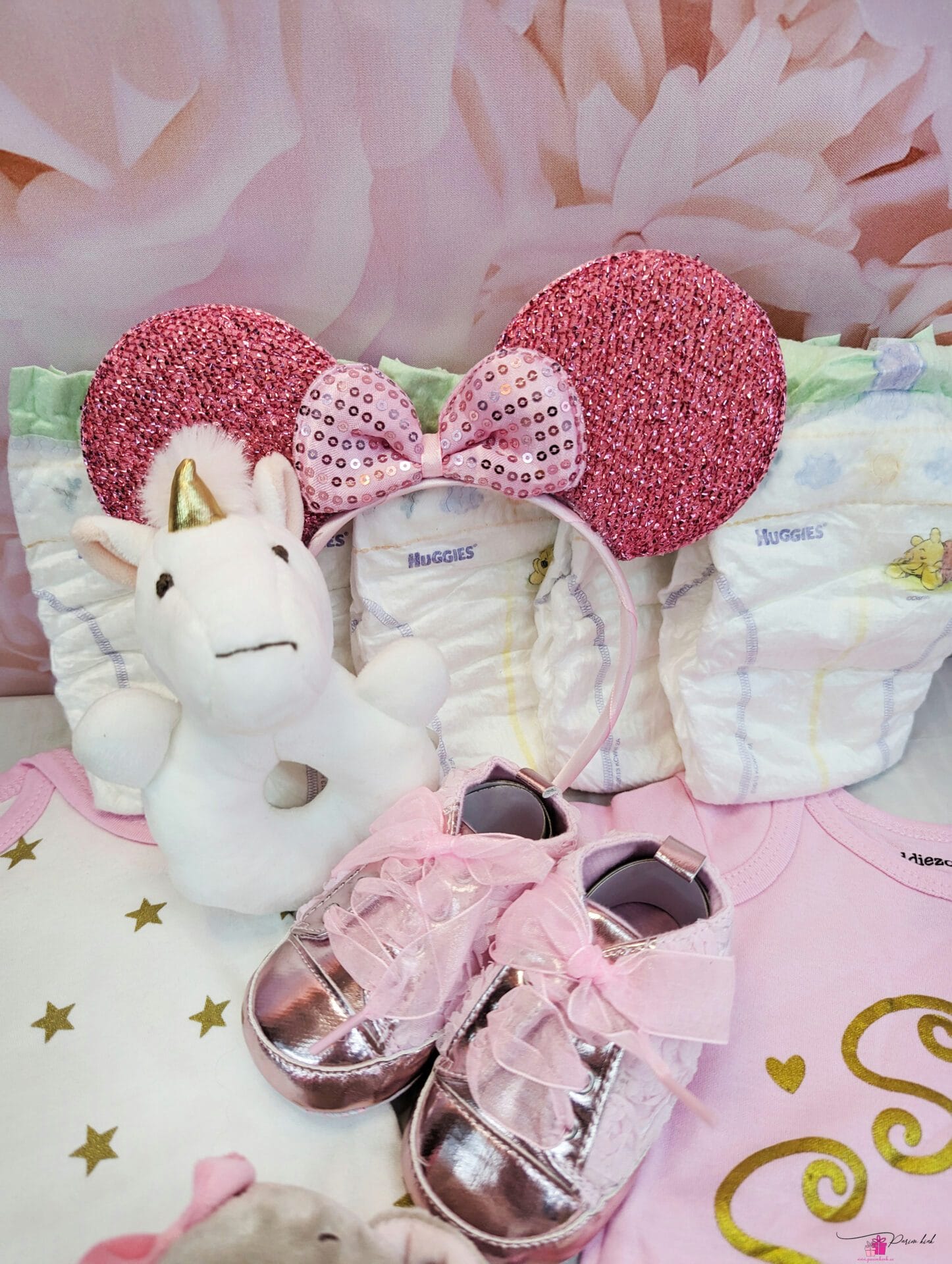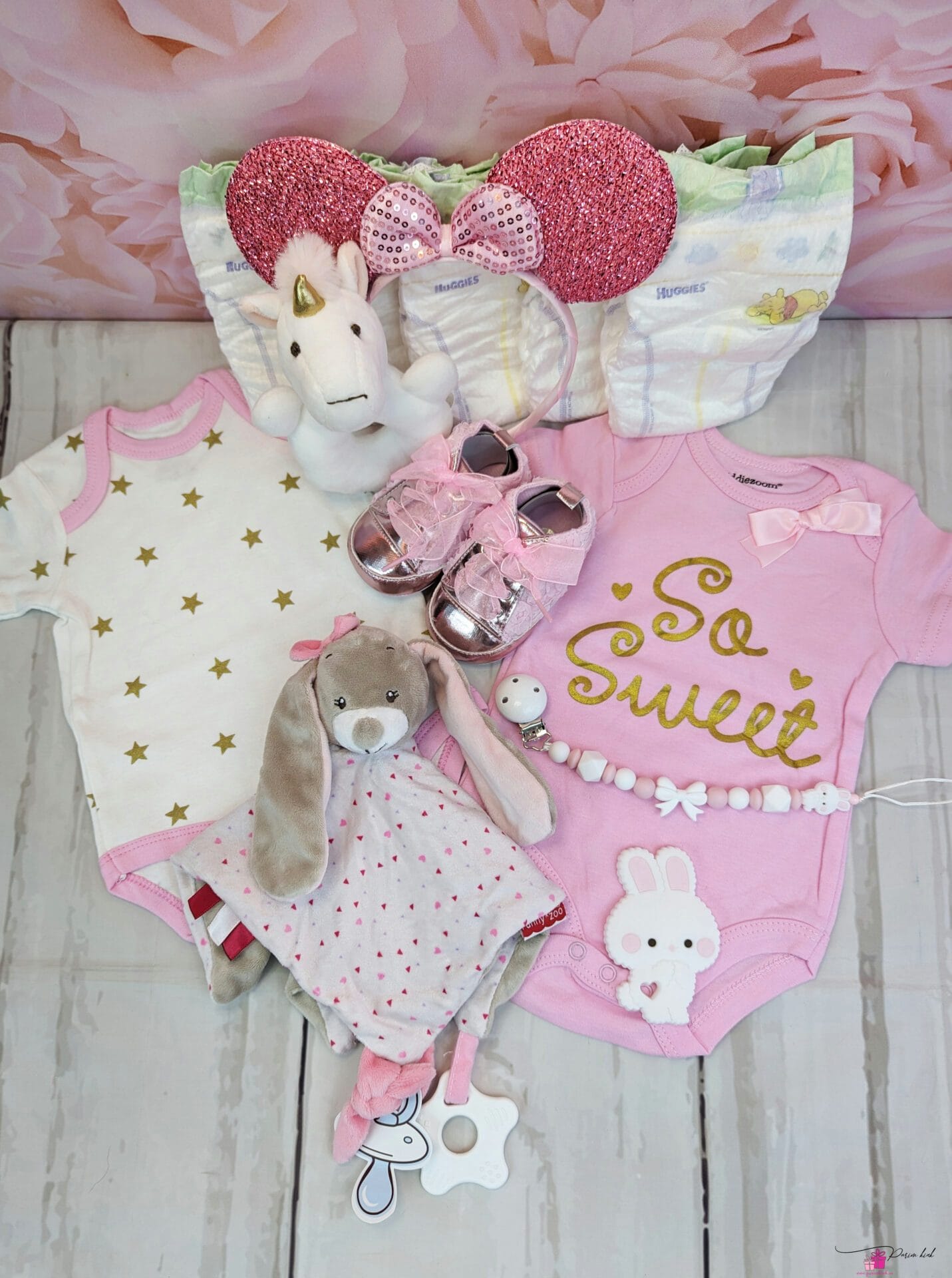 Kinkekomplekt, mis sisaldab endas jänese kaisutekki, 2tk lühikese varrukaga beebibody, Minnie kõrvadega peavõru, beebi papusid, lutiketti, närimislelu, kõristit ja 5tk Huggies Elite Soft nr 2 (4-6kg) mähet.