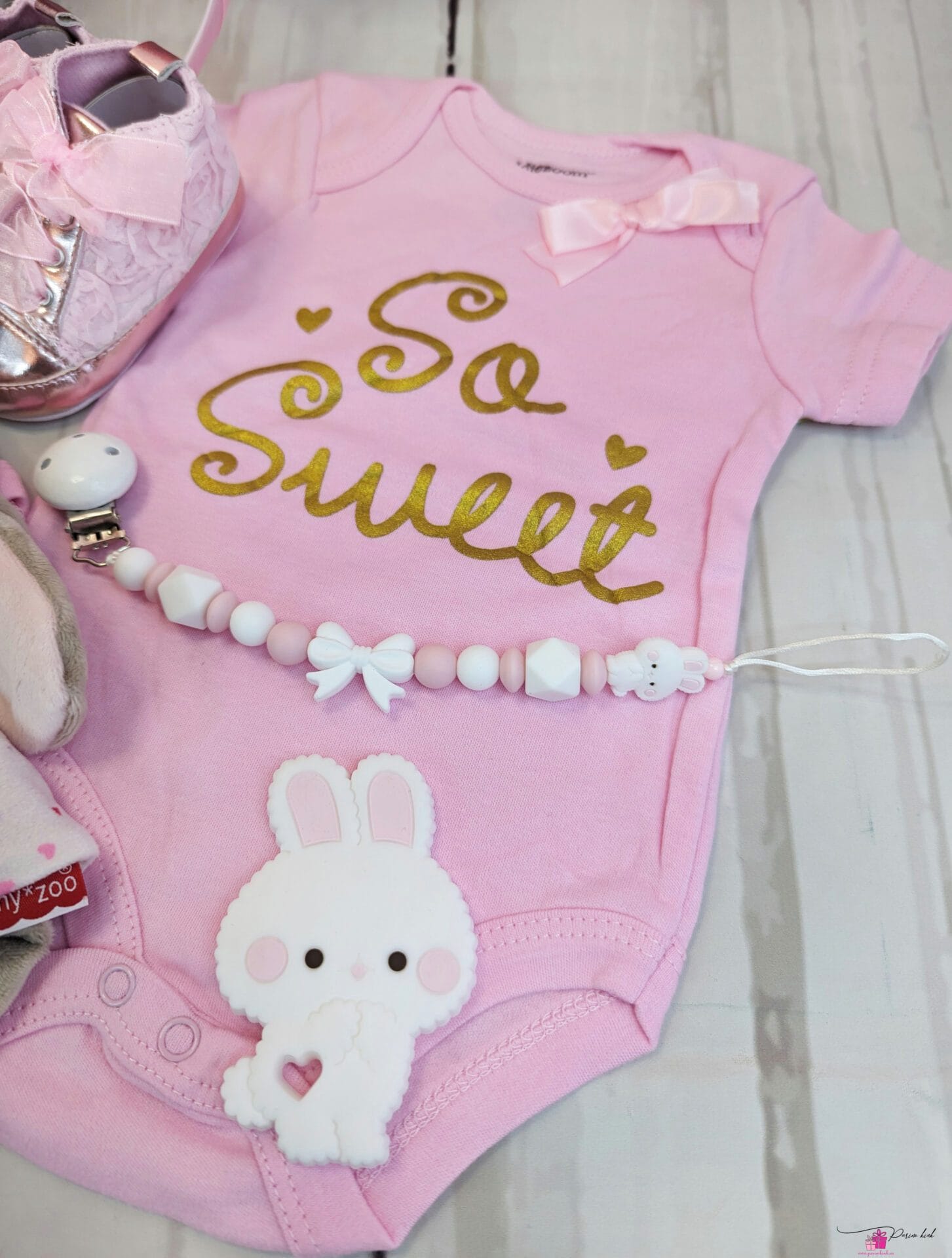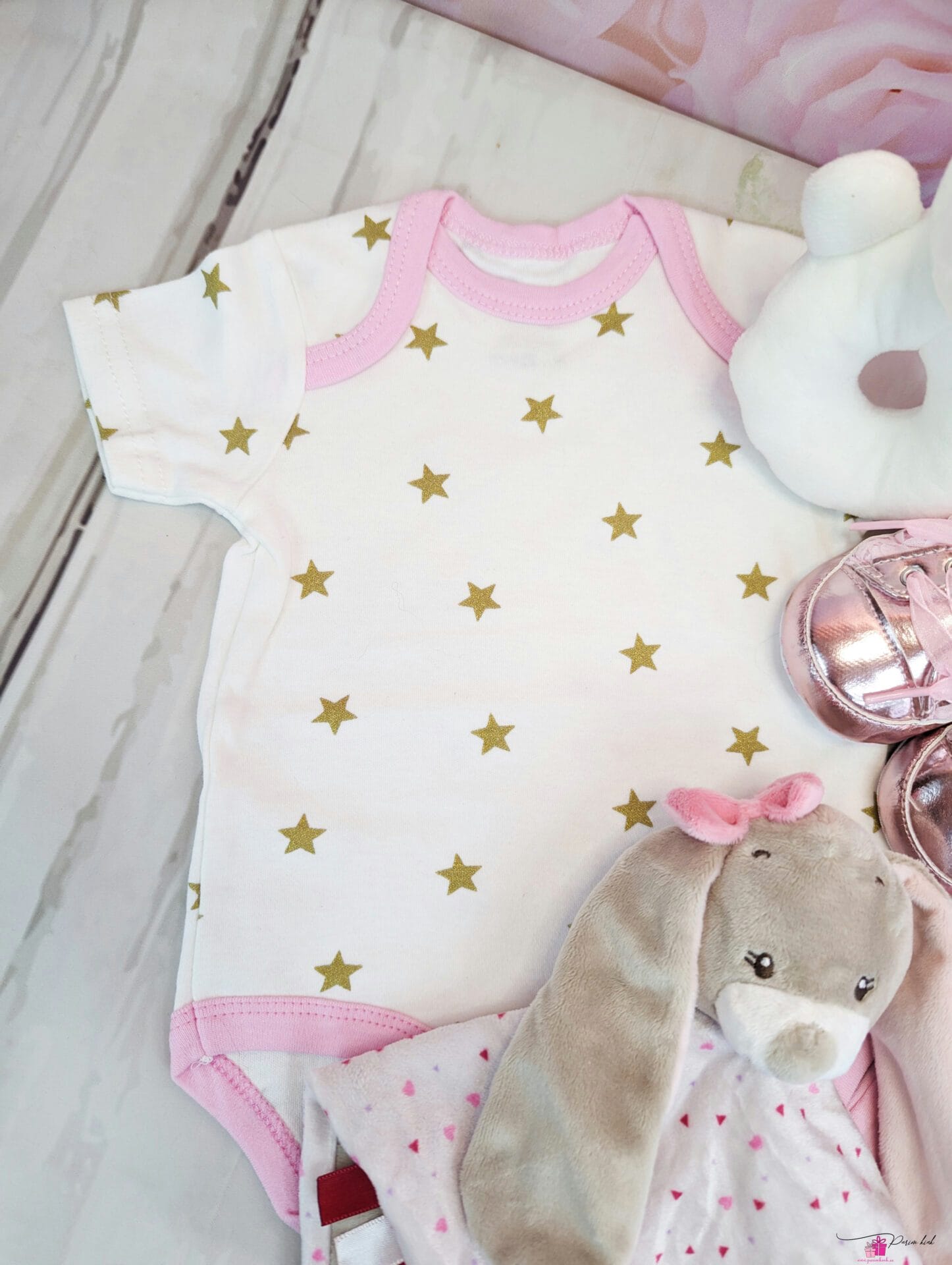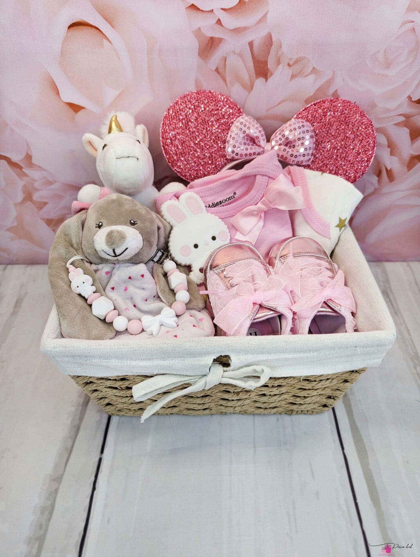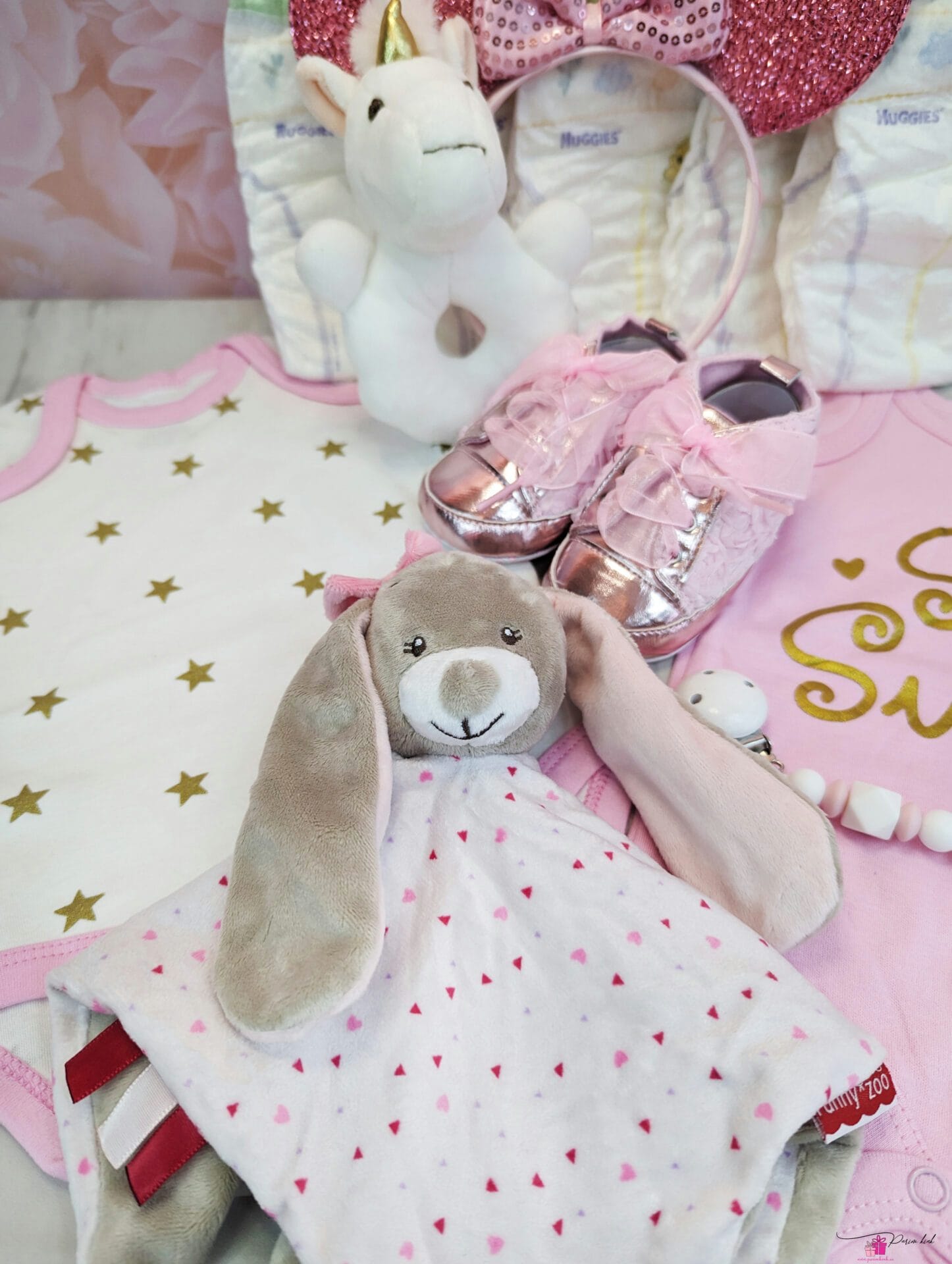 Kinkekomplekt, mis sisaldab endas jänese kaisutekki, 2tk lühikese varrukaga beebibody, Minnie kõrvadega peavõru, beebi papusid, lutiketti, närimislelu, kõristit ja 5tk Huggies Elite Soft nr 2 (4-6kg) mähet.
