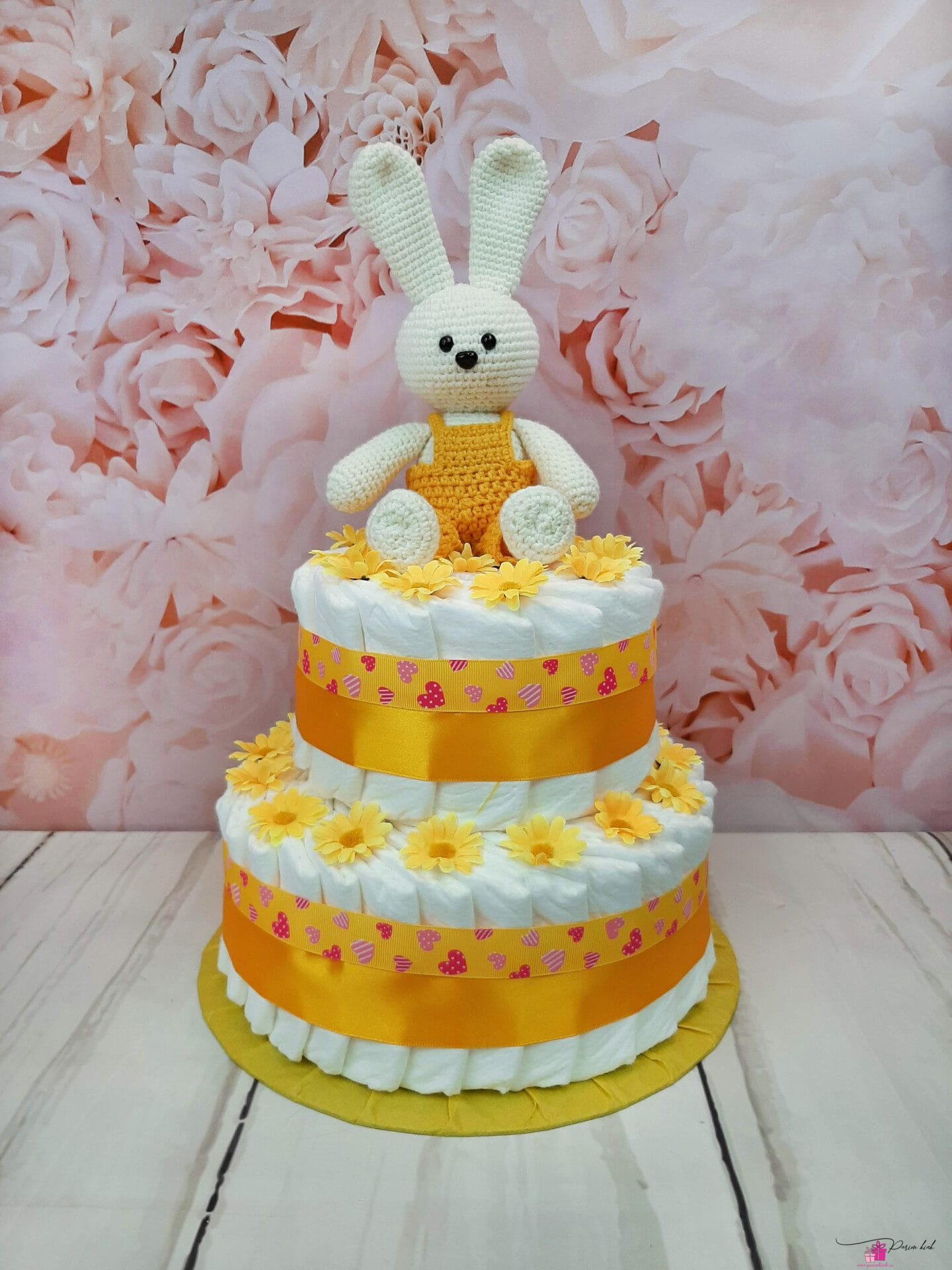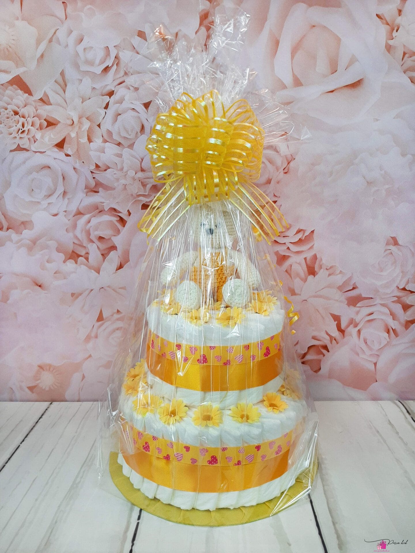 Mähkmetort on valmistatud 45-st mähkmest, pakitud tsellofaani ning kaunistatud suure rosetiga.