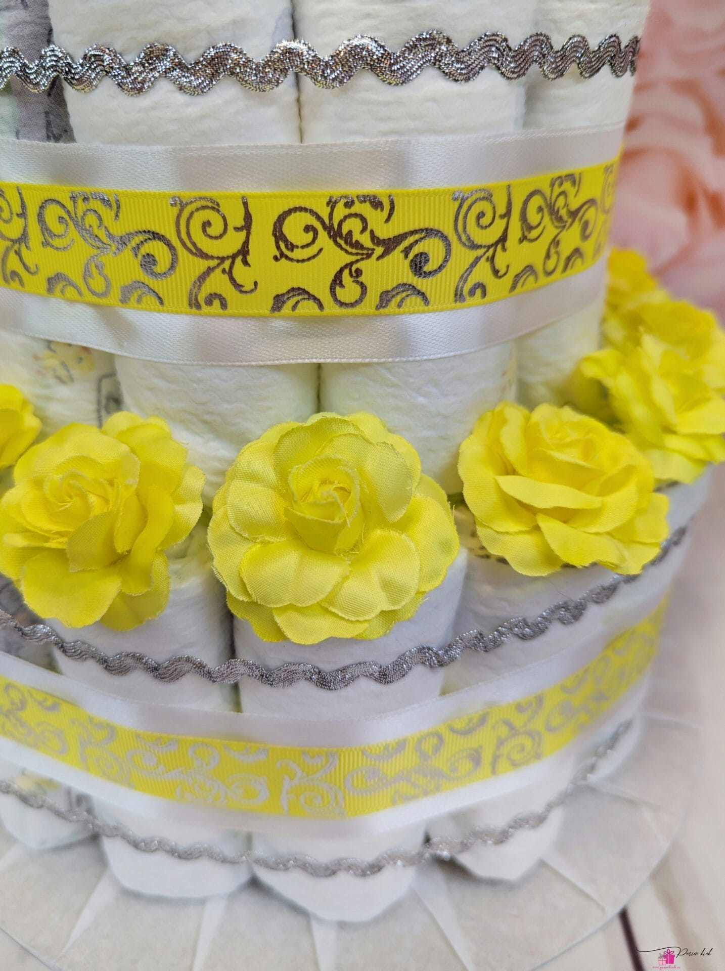 Mähkmetort on valmistatud 45-st mähkmest, pakitud tsellofaani ning kaunistatud suure rosetiga.