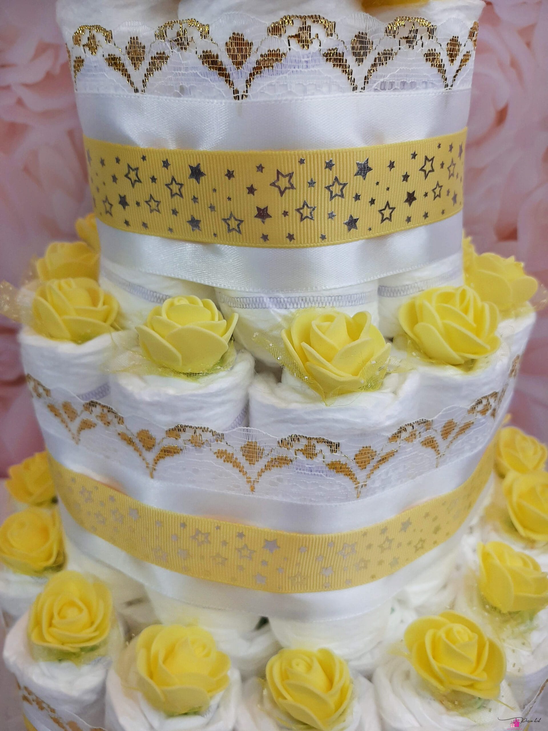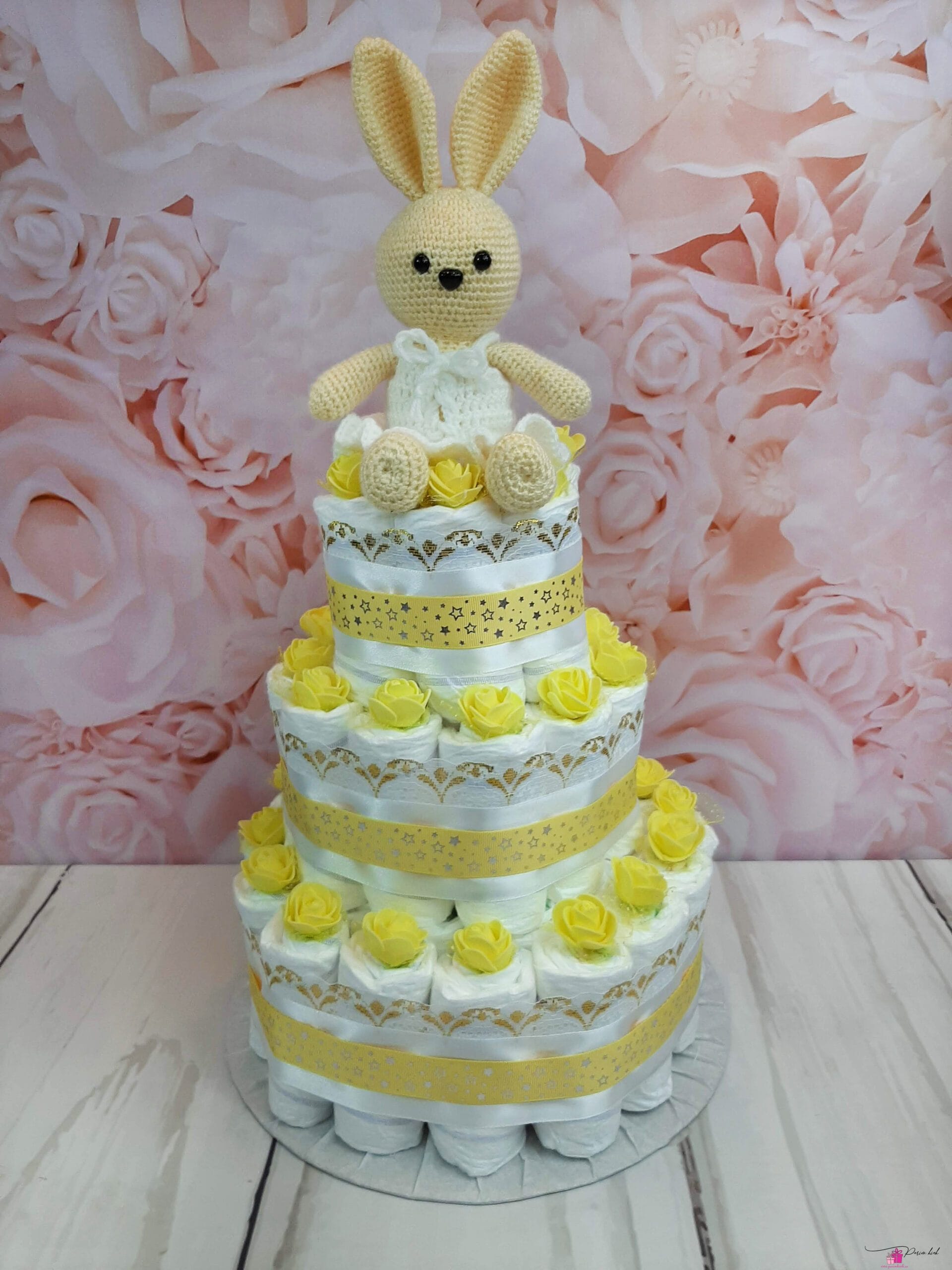 Mähkmetort on valmistatud 55-st mähkmest, pakitud tsellofaani ning kaunistatud suure rosetiga.