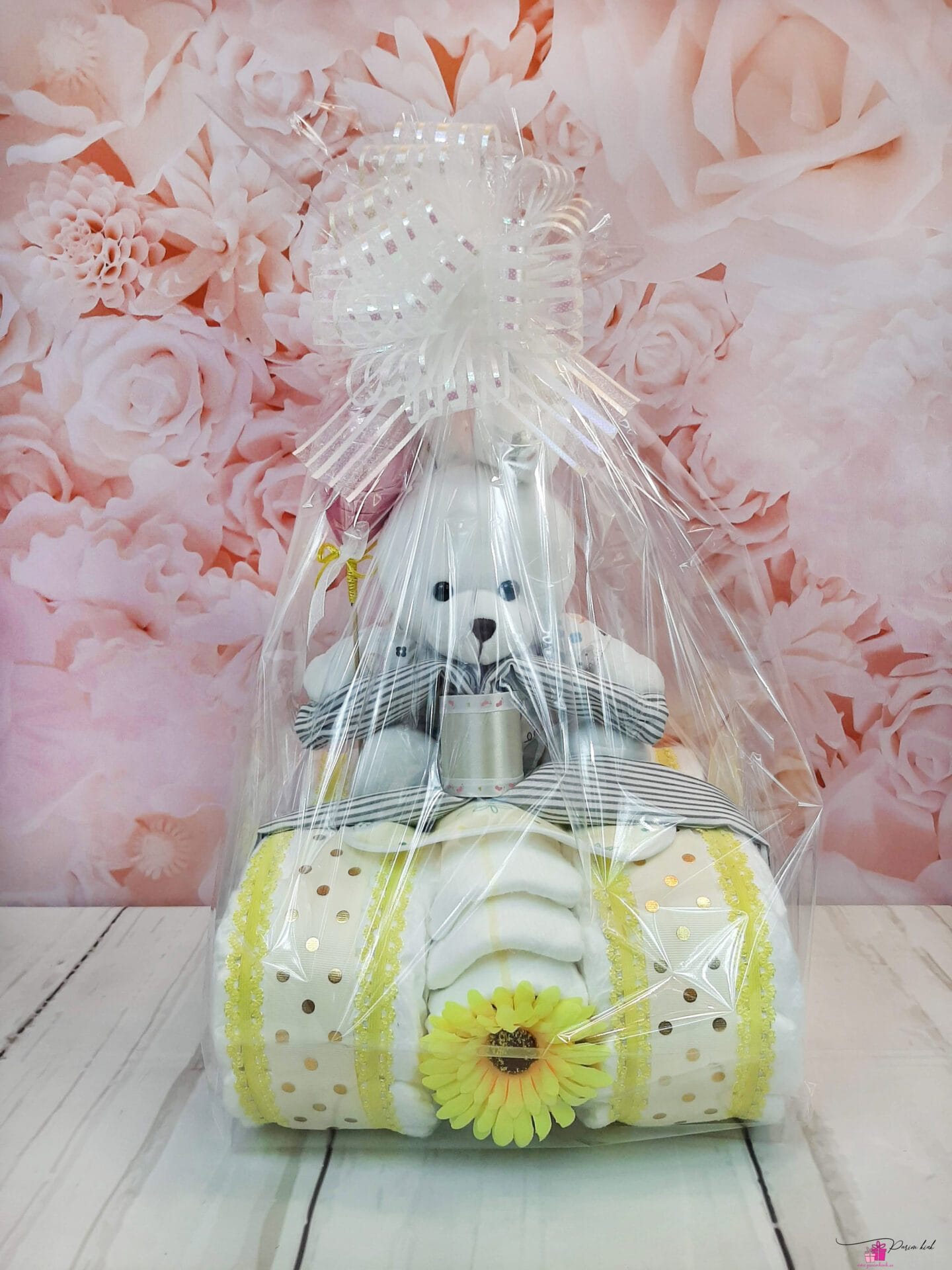 Mähkmetort on valmistatud 44-st mähkmest, pakitud tsellofaani ning kaunistatud suure rosetiga.