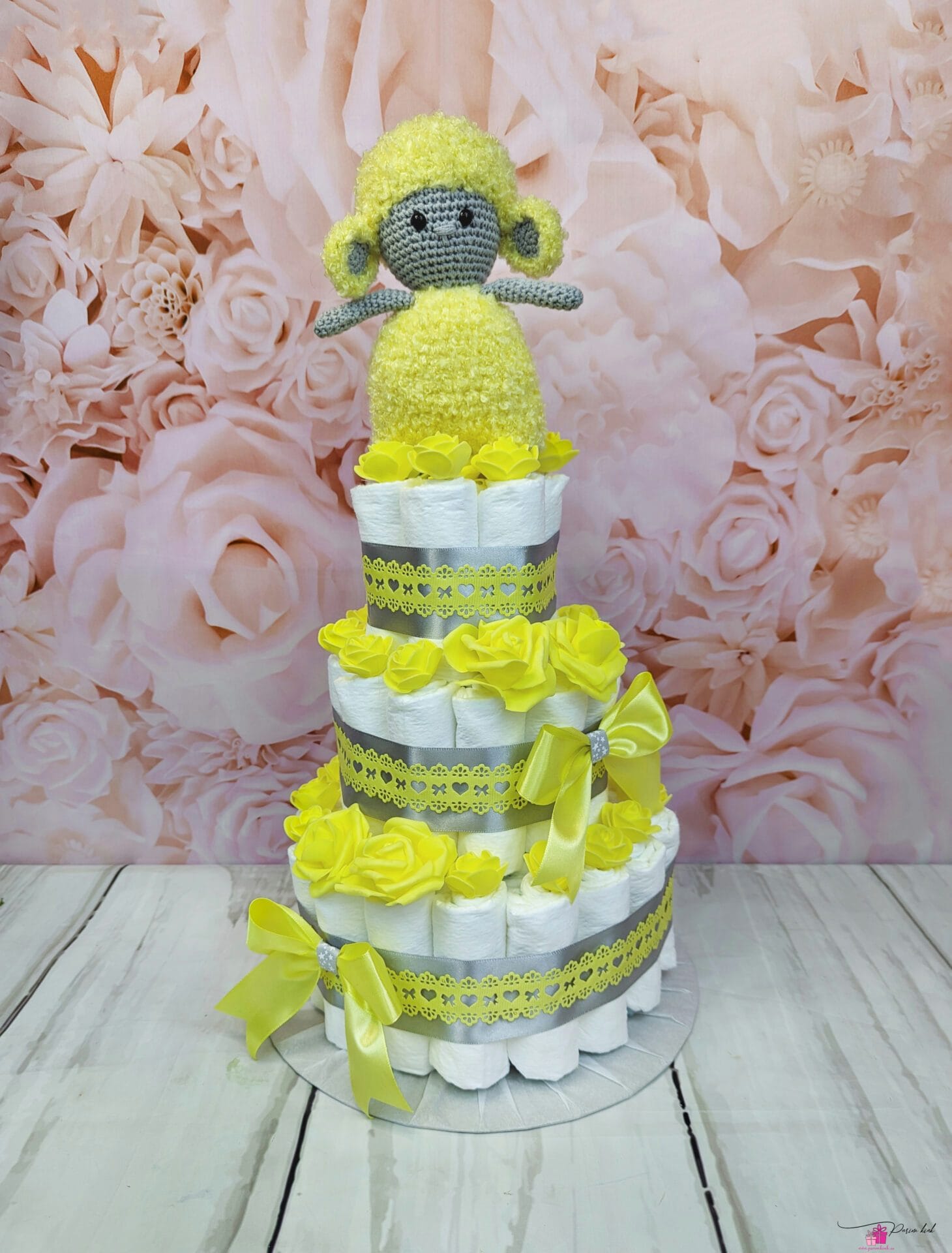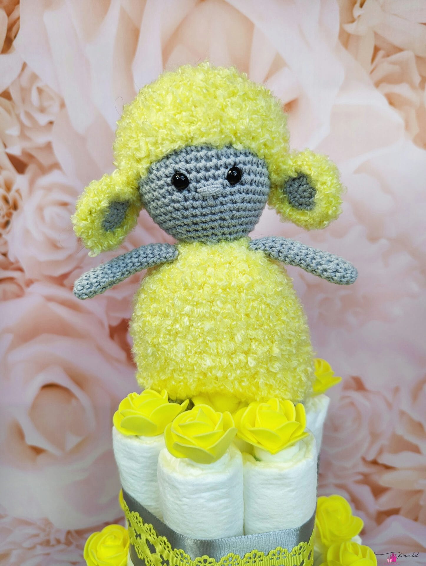 Mähkmetort, mille otsas on meie enda käsitööna heegeldatud lammas. See mähkmetort sobib kinkimiseks nii tüdrukule kui ka poisile. Lamba sees on ka kõrin, et beebil oleks mää-määga huvitavam mängida.