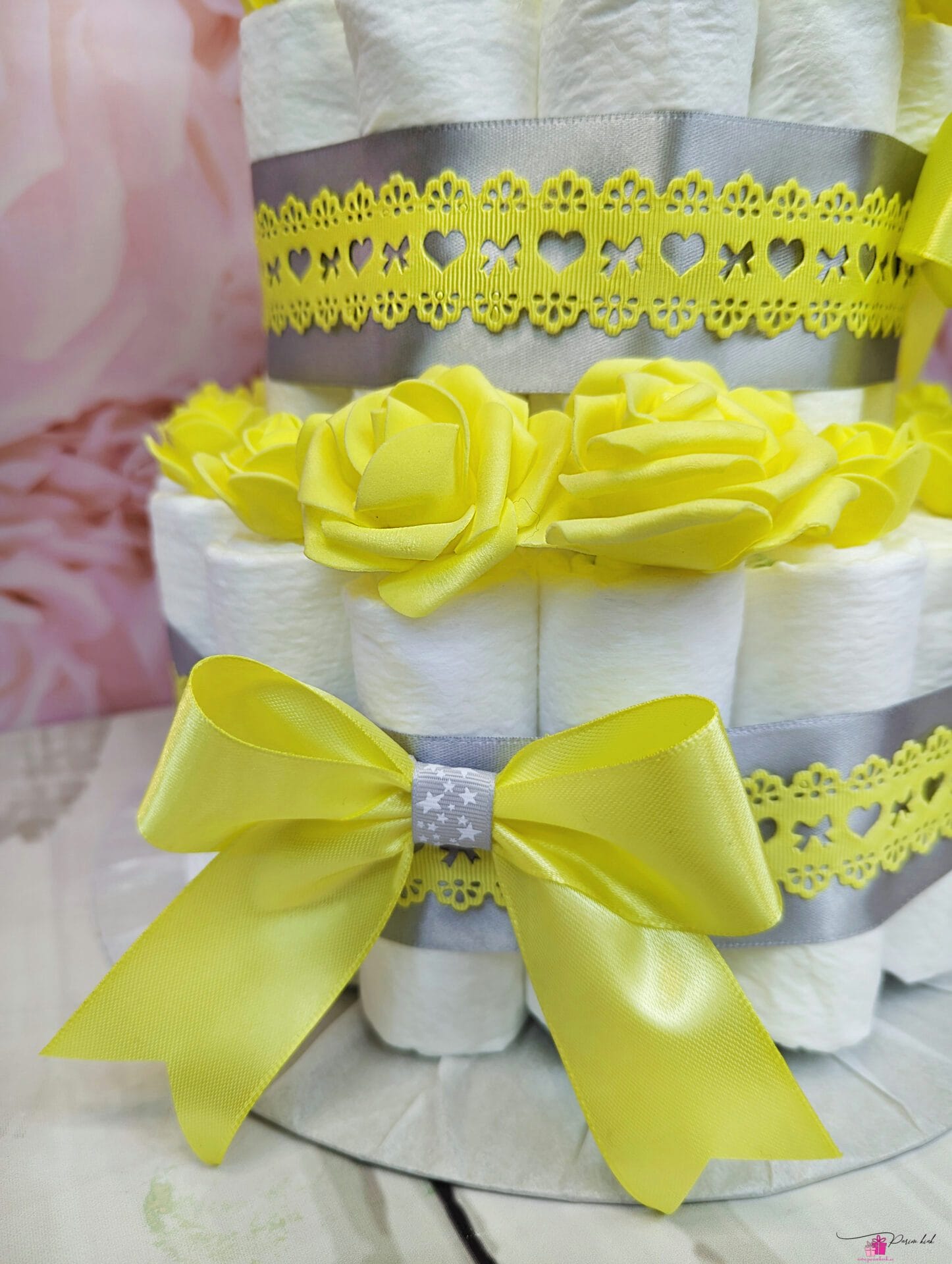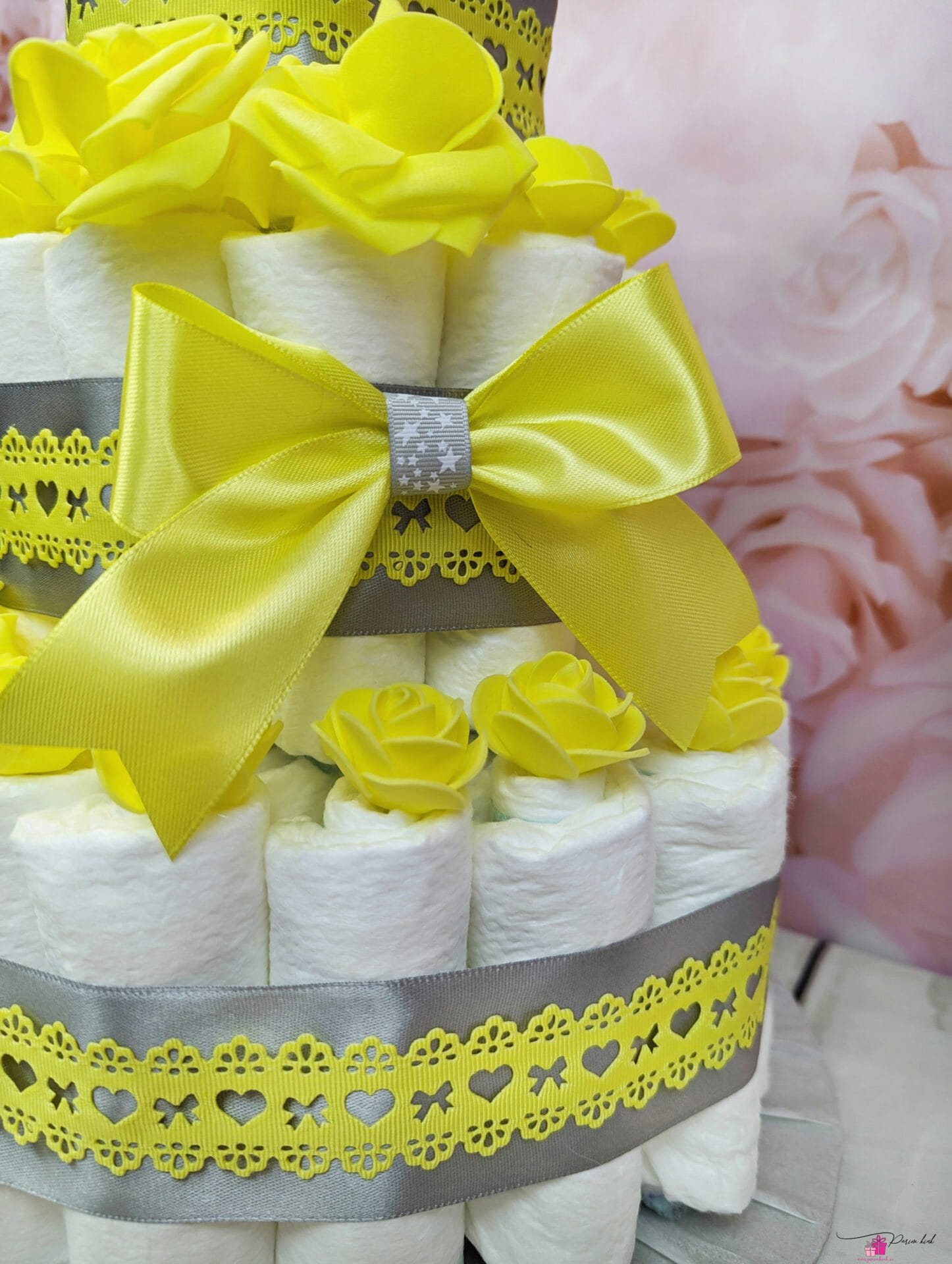 Mähkmetort on valmistatud 55-st mähkmest, pakitud tsellofaani ning kaunistatud suure rosetiga.