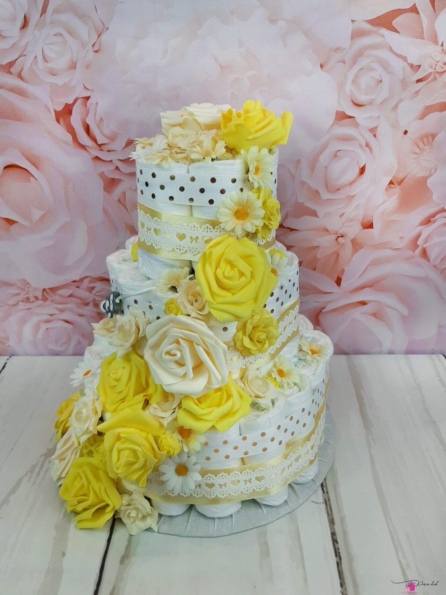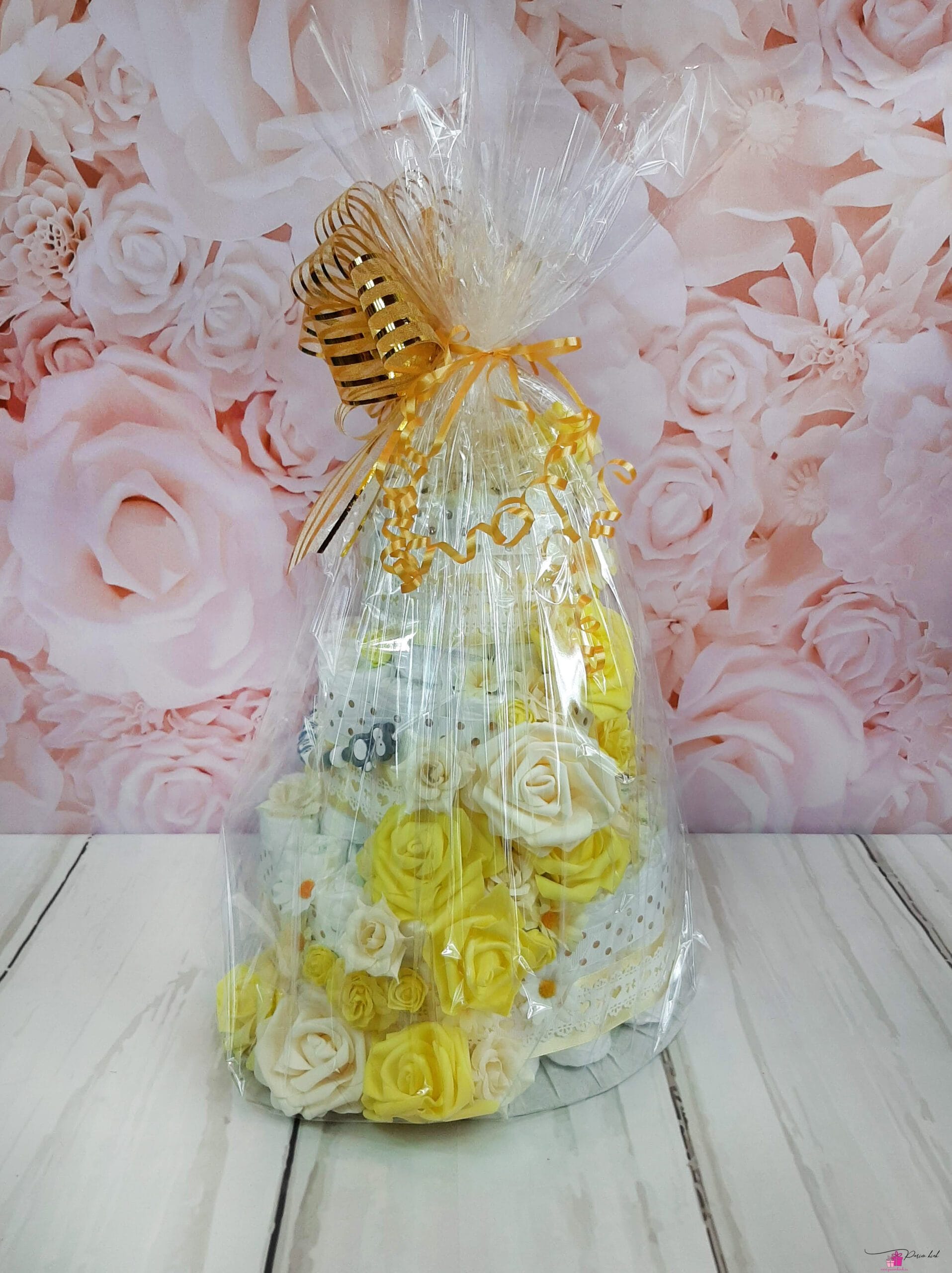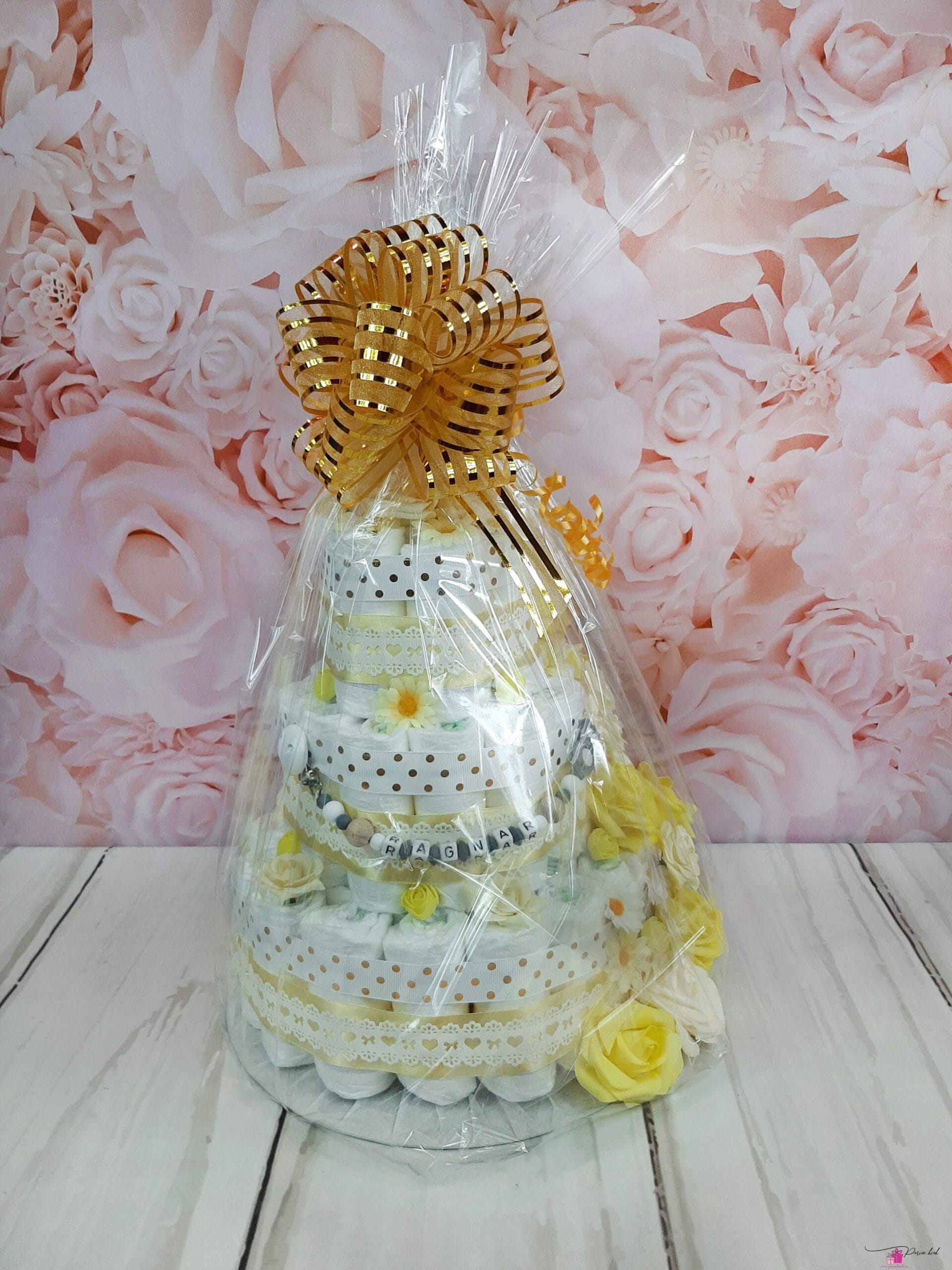 Mähkmetort on valmistatud 55-st mähkmest, pakitud tsellofaani ning kaunistatud suure rosetiga.