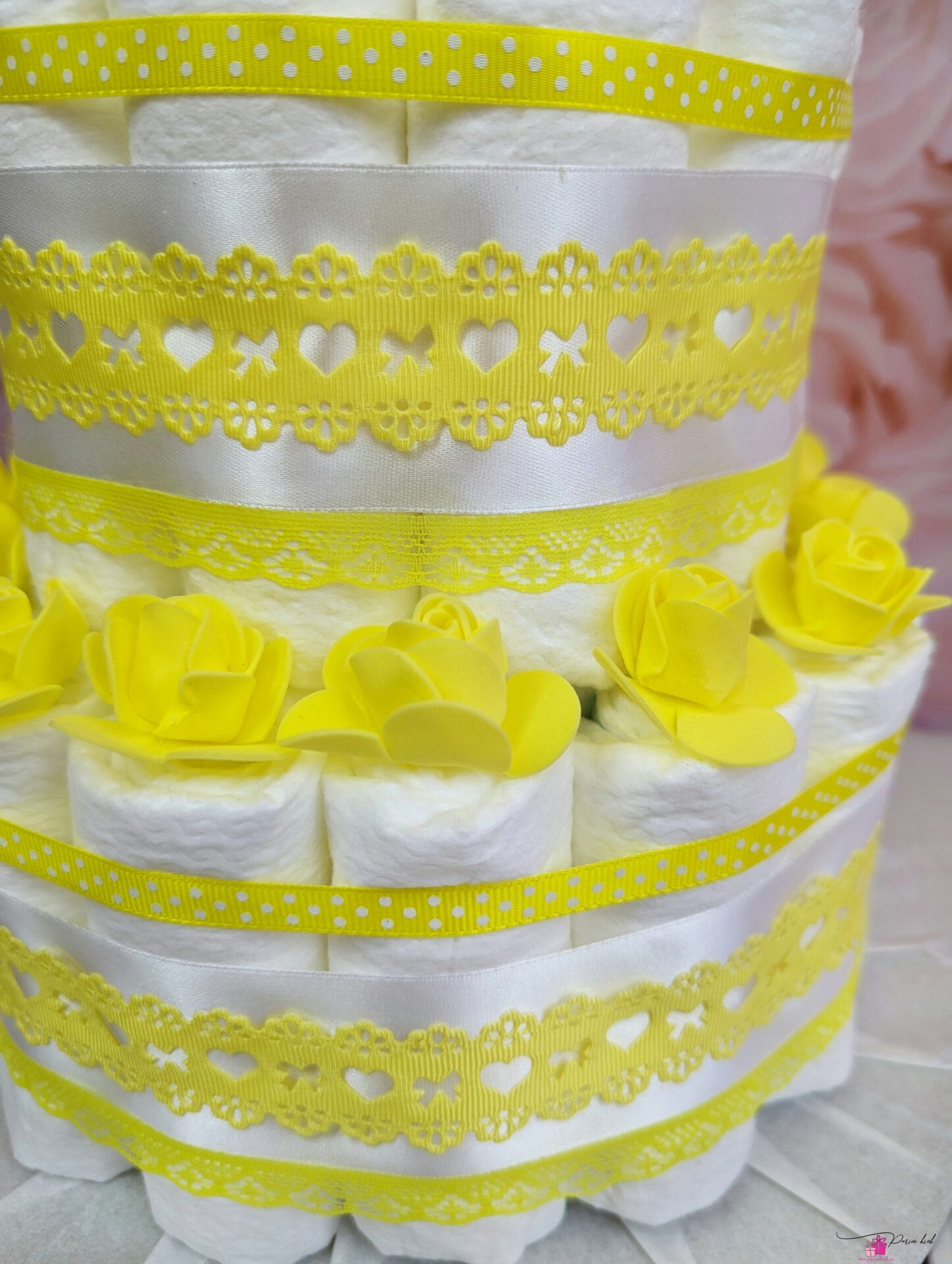 Mähkmetort on valmistatud 45-st mähkmest, pakitud tsellofaani ning kaunistatud suure rosetiga.