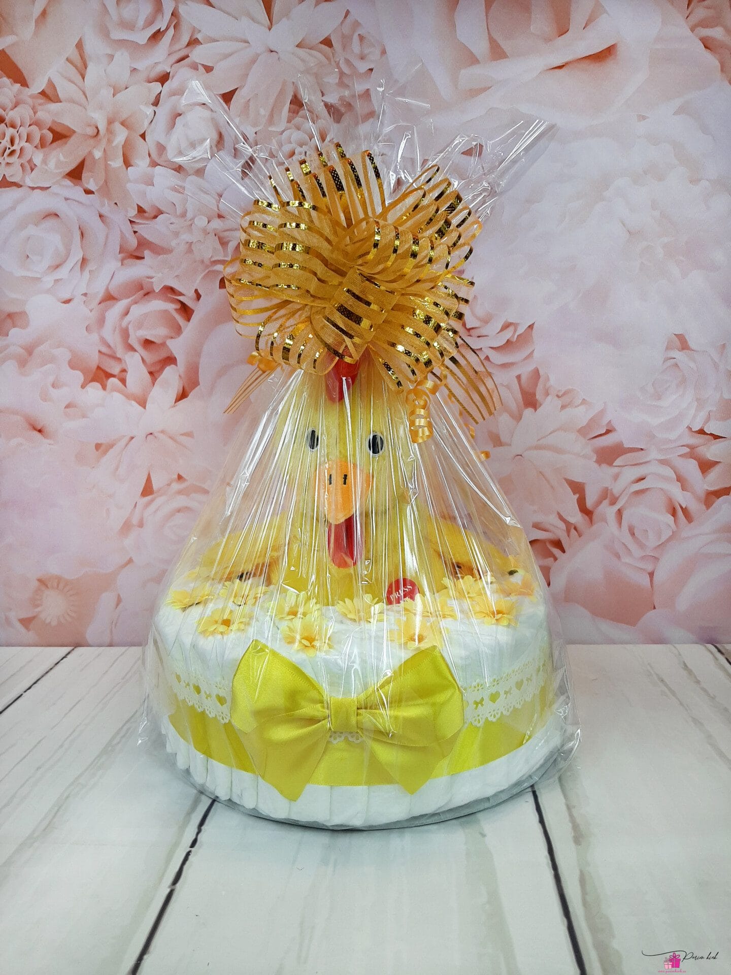 Mähkmetort on valmistatud 36-st Pampers Premium Care nr. 2 (4-8kg) mähkmest, pakitud tsellofaani ning kaunistatud suure rosetiga.