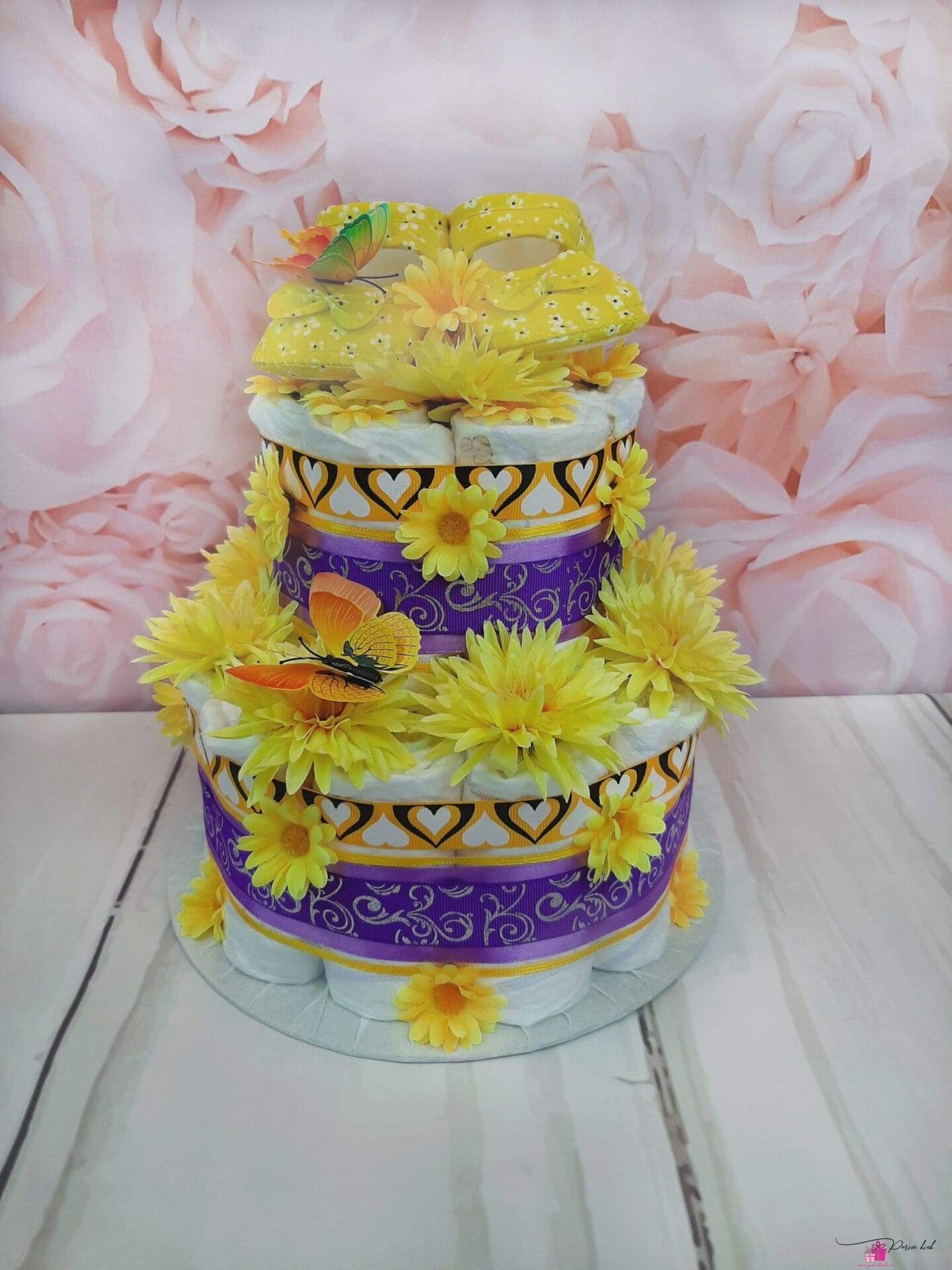 Mähkmetort on valmistatud 25-st mähkmest, pakitud tsellofaani ning kaunistatud suure rosetiga.
