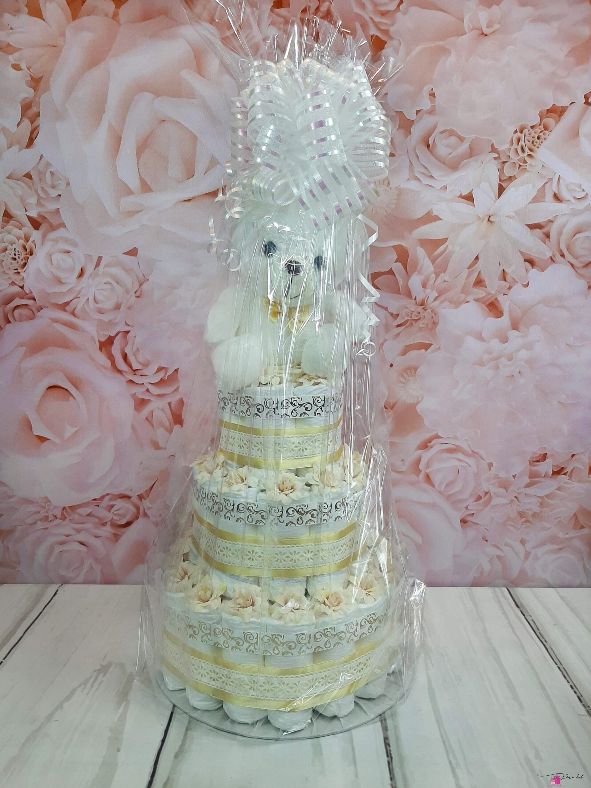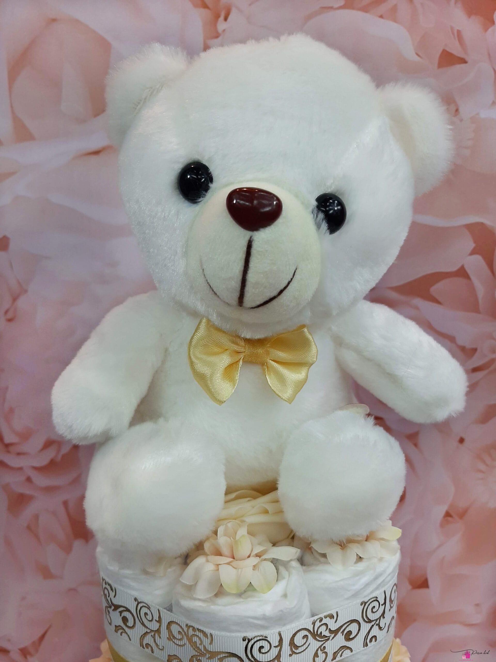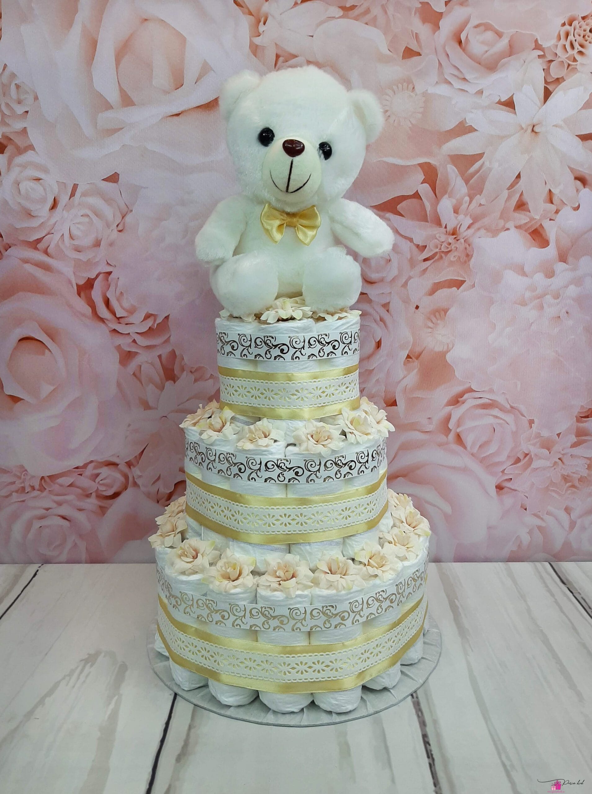 Kuldse ja valgega mähkmetort, mis sobib kinkimiseks nii poisile kui ka tüdrukule. Tordi otsas olev karu on LED valgustusega, mida saab vastavalt soovile sisse ja välja lülitada. Patareid kuuluvad komplekti.