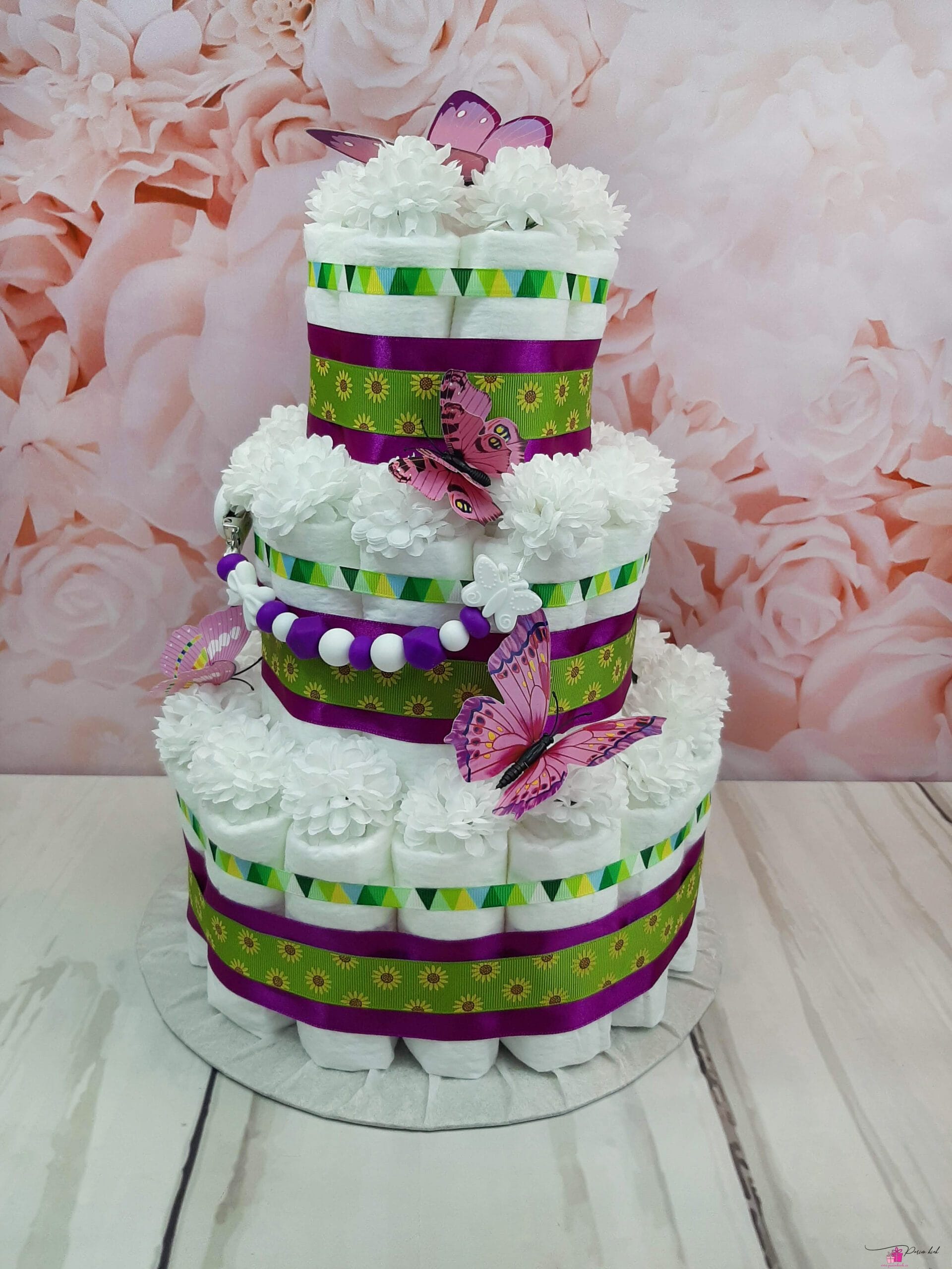 Kes ütles, et kõik mähkmetordid peavad olema roosad? Ei pea! Valmis sai üks kevadine liblikatega lilla-roheline mähkmetort! Tort sisaldab lisaks mähkmetele ka lutiketti, mis on soovi korral võimalik ka nimelisena meisterdada.