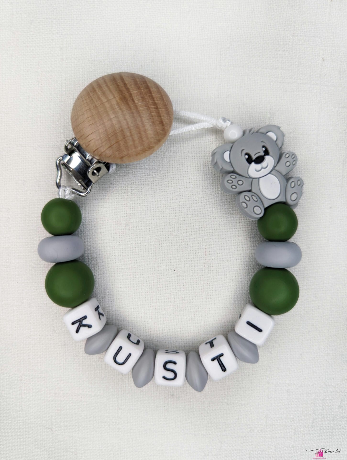 Lutiketi materjalina kasutame BPA vabast silikoonist pärleid, nimetähed akrüülist ning puidust kinnitust.