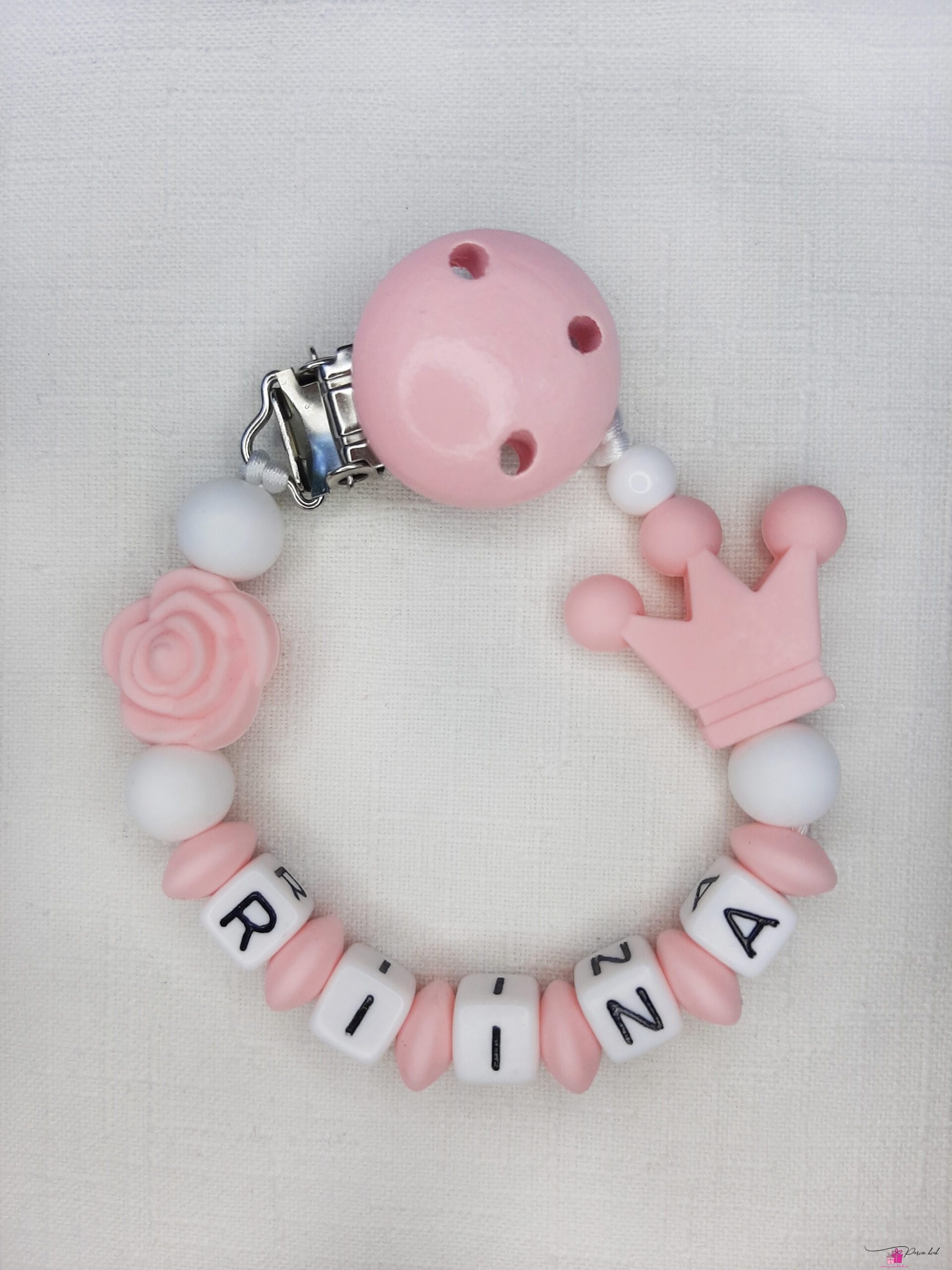 Lutiketi materjalina kasutame BPA vabast silikoonist pärleid, nimetähed akrüülist ning puidust kinnitust.