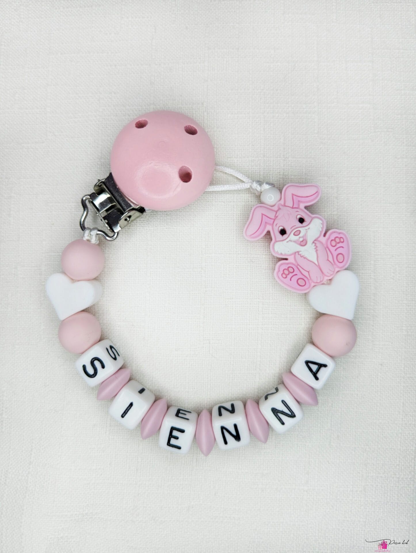 Lutiketi materjalina kasutame BPA vabast silikoonist pärleid, nimetähed akrüülist ning puidust kinnitust.