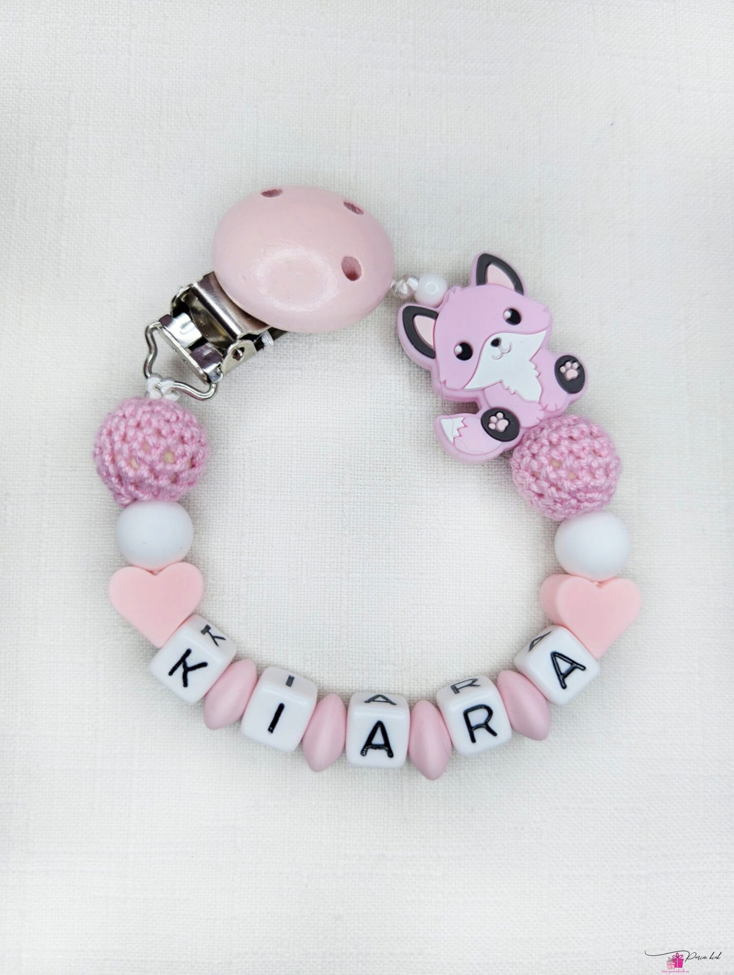 Lutiketi materjalina kasutame BPA vabast silikoonist pärleid, nimetähed akrüülist ning puidust kinnitust.