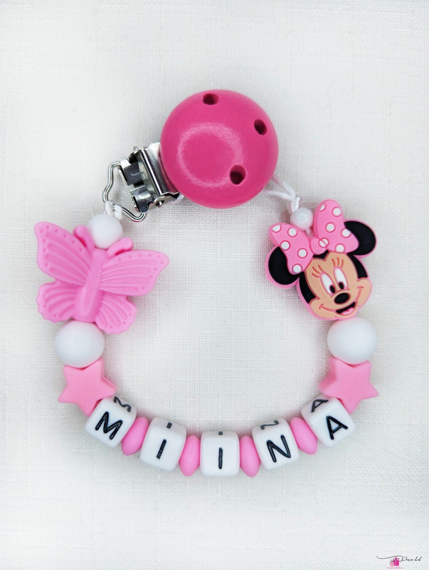 Lutiketi materjalina kasutame BPA vabast silikoonist pärleid, nimetähed akrüülist ning puidust kinnitust.