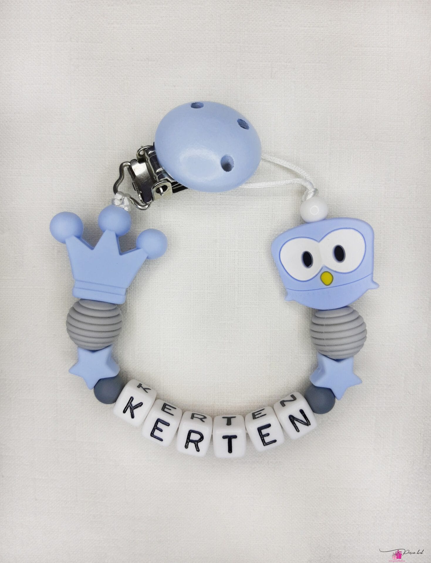 Lutiketi materjalina kasutame BPA vabast silikoonist pärleid, nimetähed akrüülist ning puidust kinnitust.