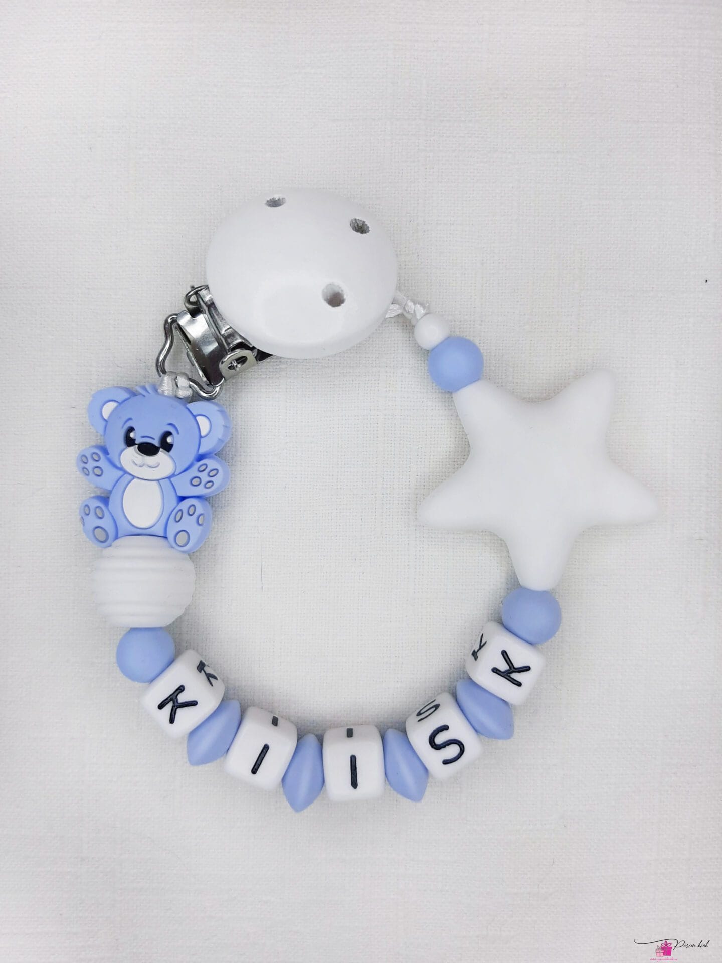 Lutiketi materjalina kasutame BPA vabast silikoonist pärleid, nimetähed akrüülist ning puidust kinnitust.