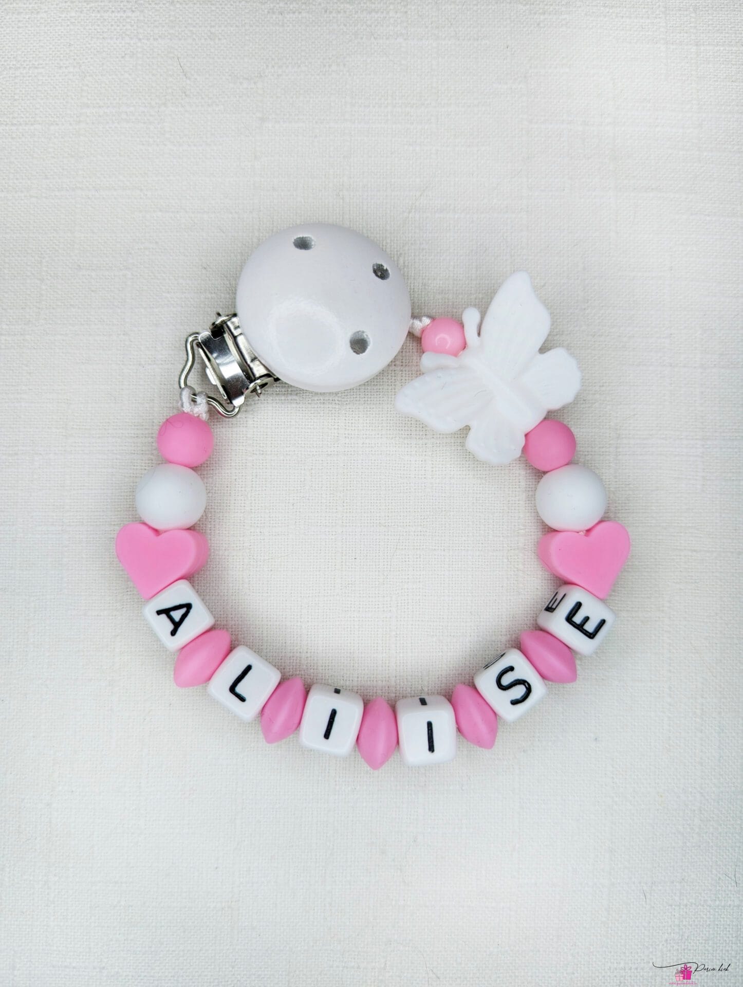 Lutiketi materjalina kasutame BPA vabast silikoonist pärleid, nimetähed akrüülist ning puidust kinnitust.