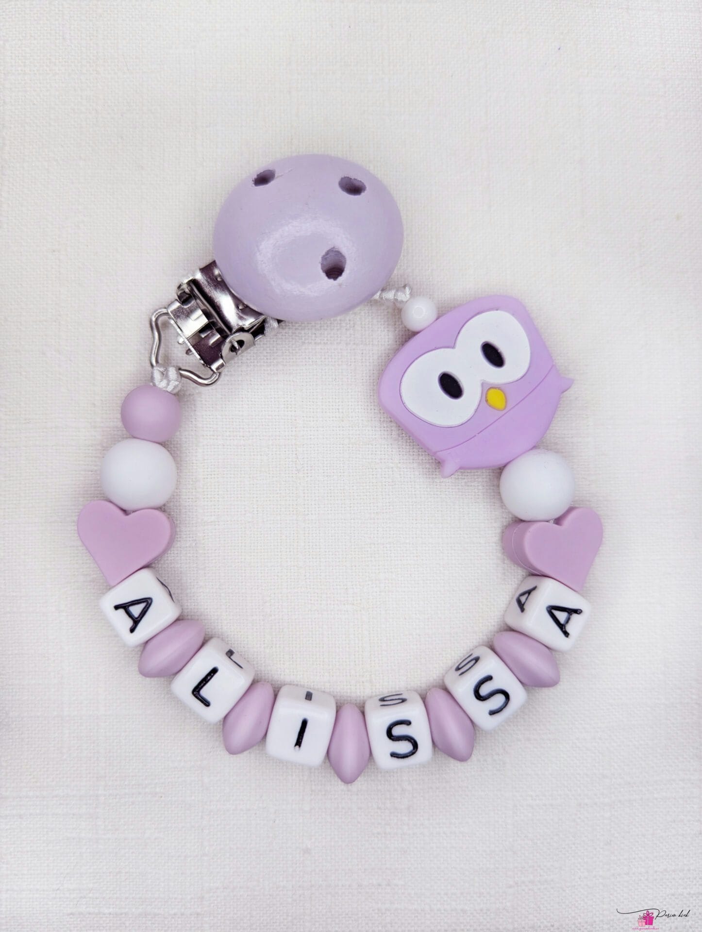 Lutiketi materjalina kasutame BPA vabast silikoonist pärleid, nimetähed akrüülist ning puidust kinnitust.