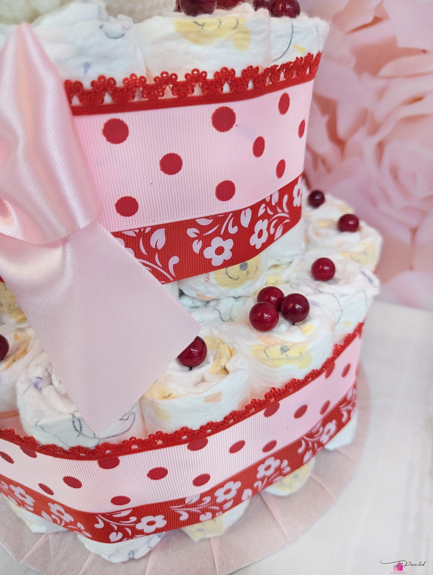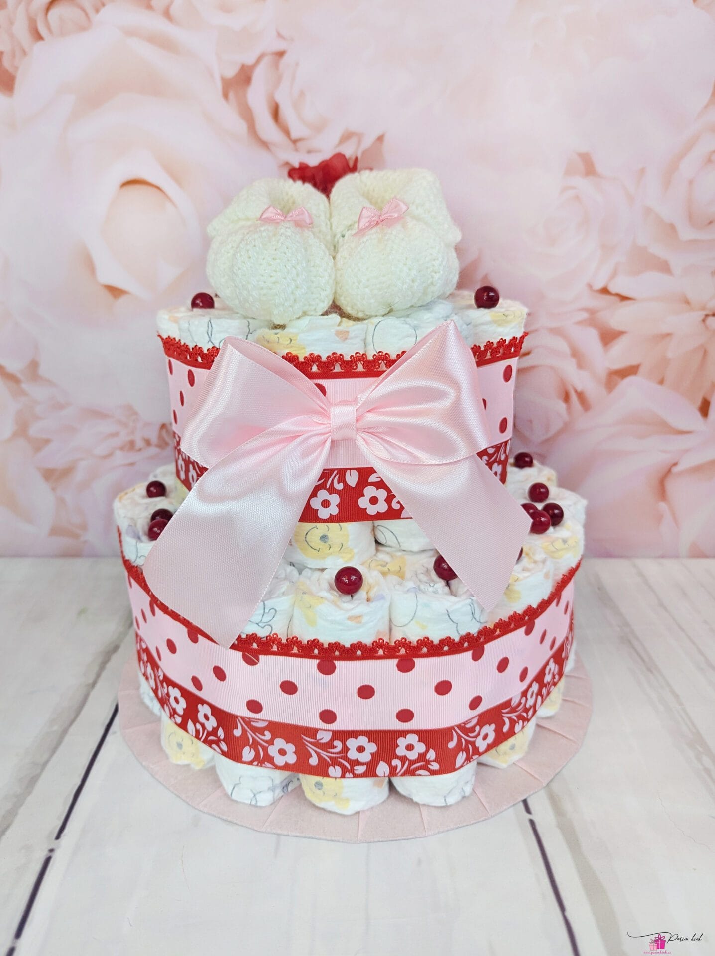 Mähkmetort on valmistatud 45-st mähkmest, pakitud tsellofaani ning kaunistatud suure rosetiga.
