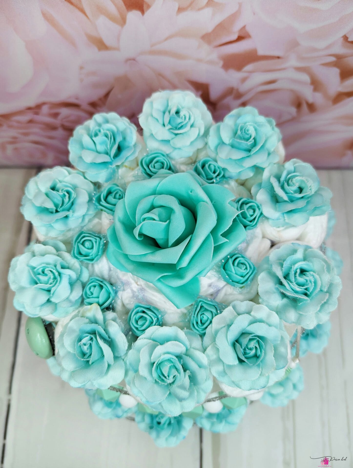 Mähkmetort on valmistatud 45-st mähkmest, pakitud tsellofaani ning kaunistatud suure rosetiga.