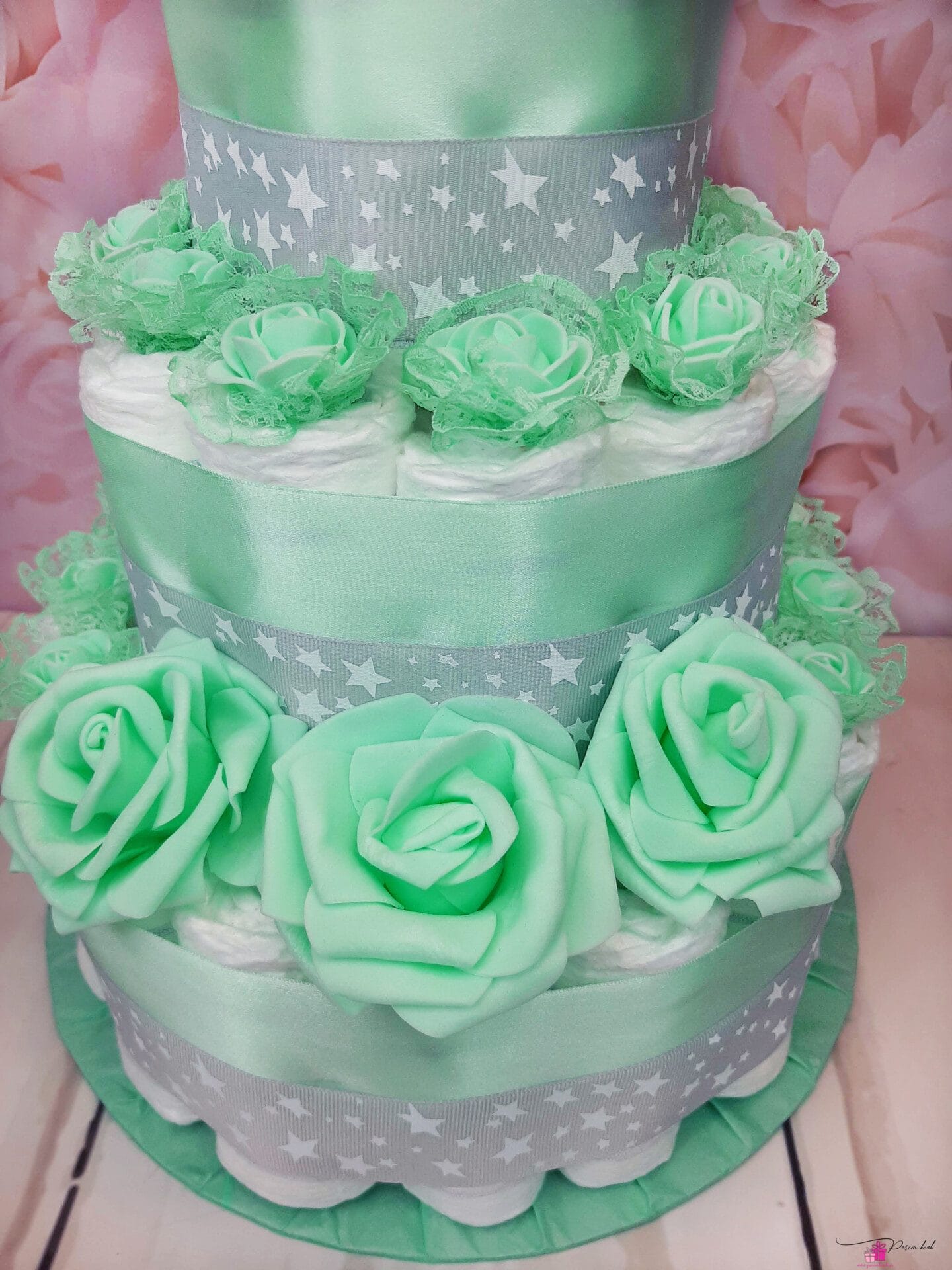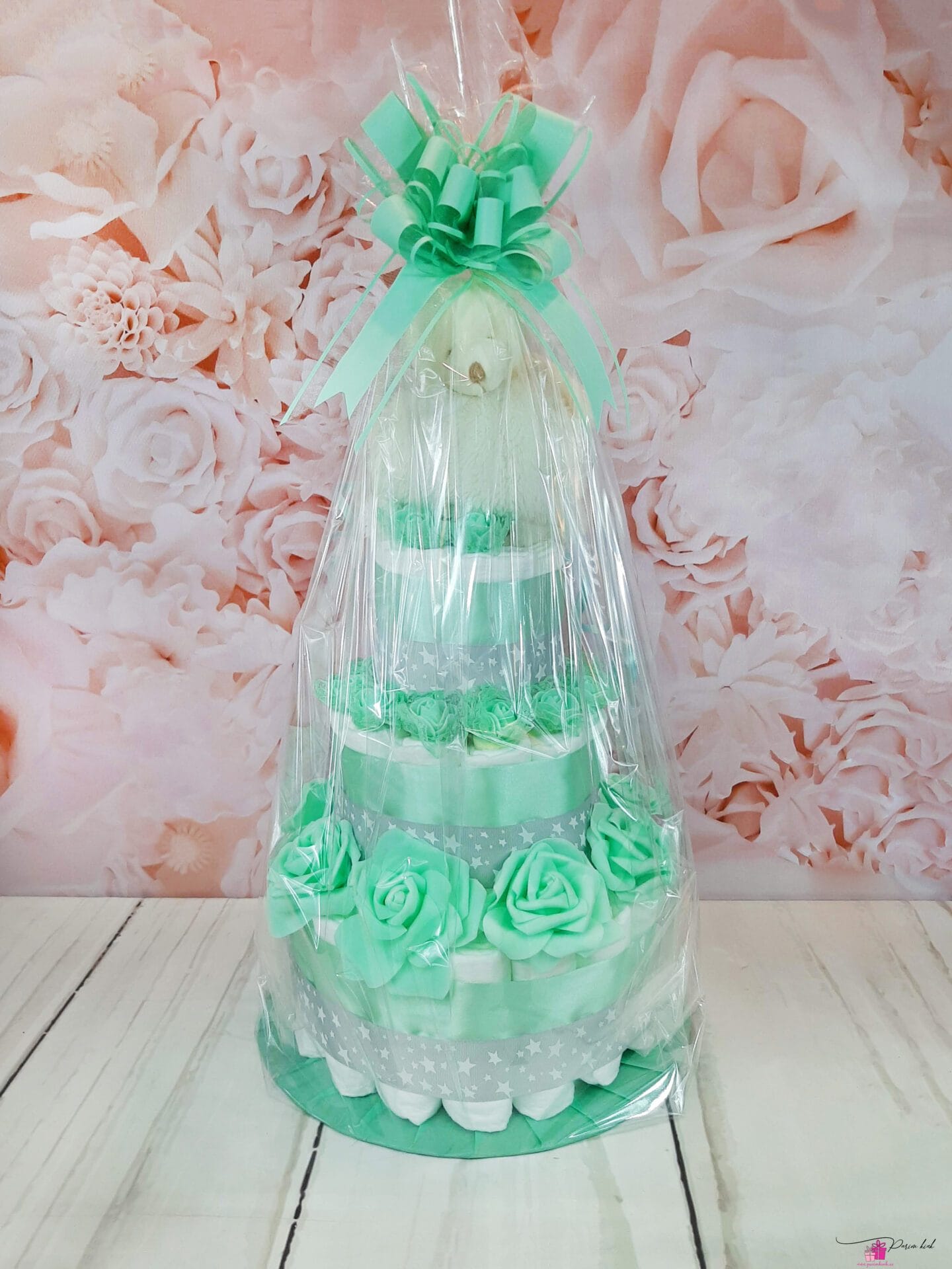 Mähkmetort on valmistatud 55-st mähkmest, pakitud tsellofaani ning kaunistatud suure rosetiga.
