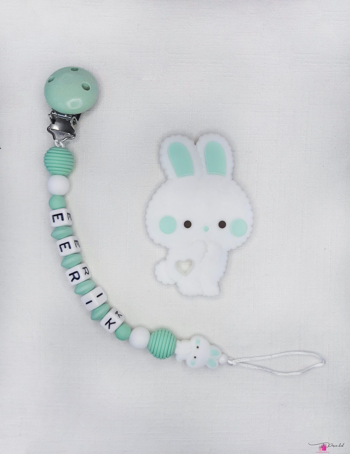 Lutiketi materjalina kasutame BPA vabast silikoonist pärleid, nimetähed akrüülist ning puidust kinnitust.