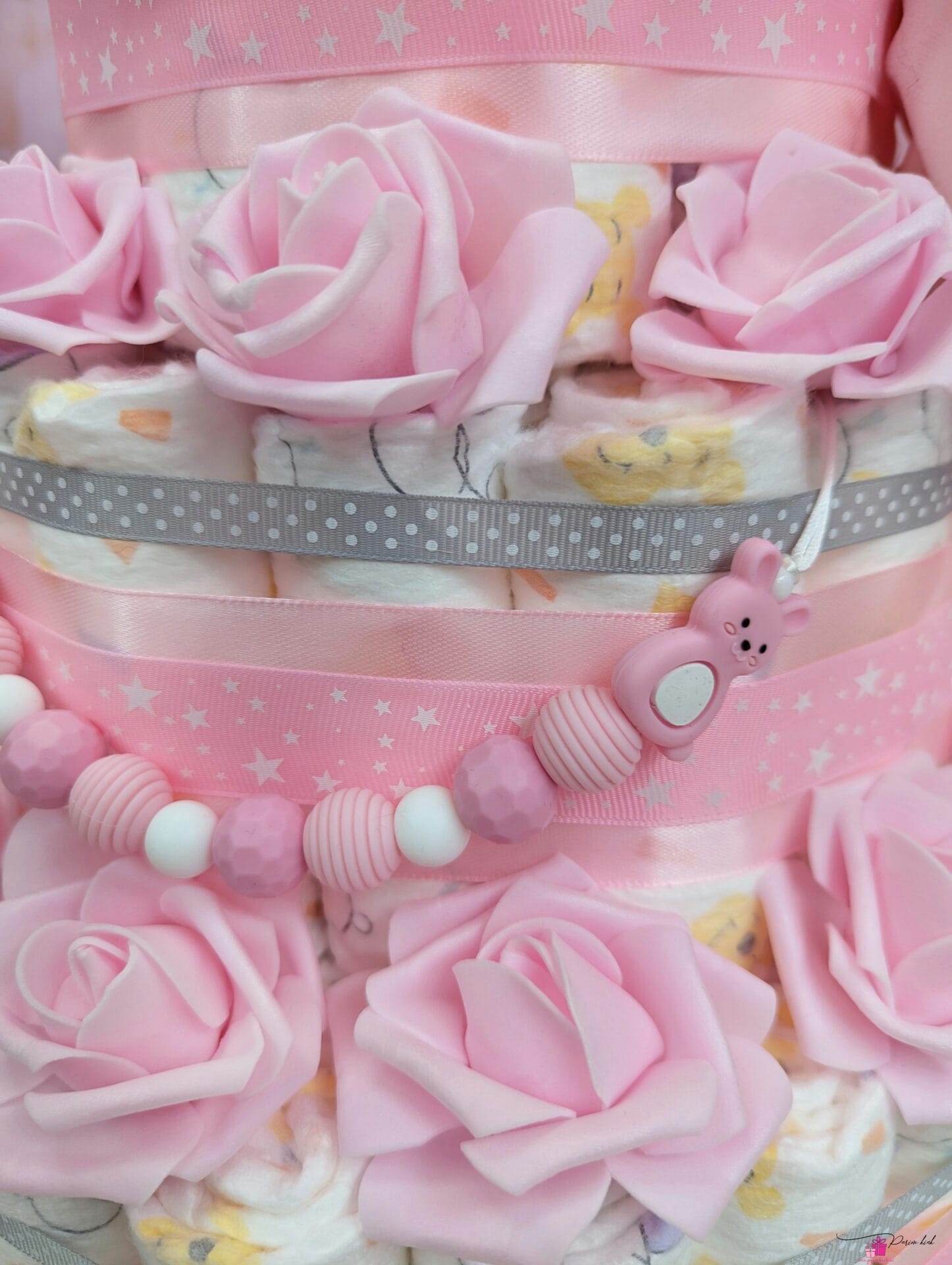 See mähkmetort on HIIGLANE! Ausalt, sõna otseses mõttes! Tegu on neljakordse mähkmetordiga, mis sisaldab 103 mähet meie tavapärase 55 mähkme asemel. Tort sisaldab lisaks mähkmetele ja kaisutekile ka lutiketti, mis võib olla soovi korral nimeline.