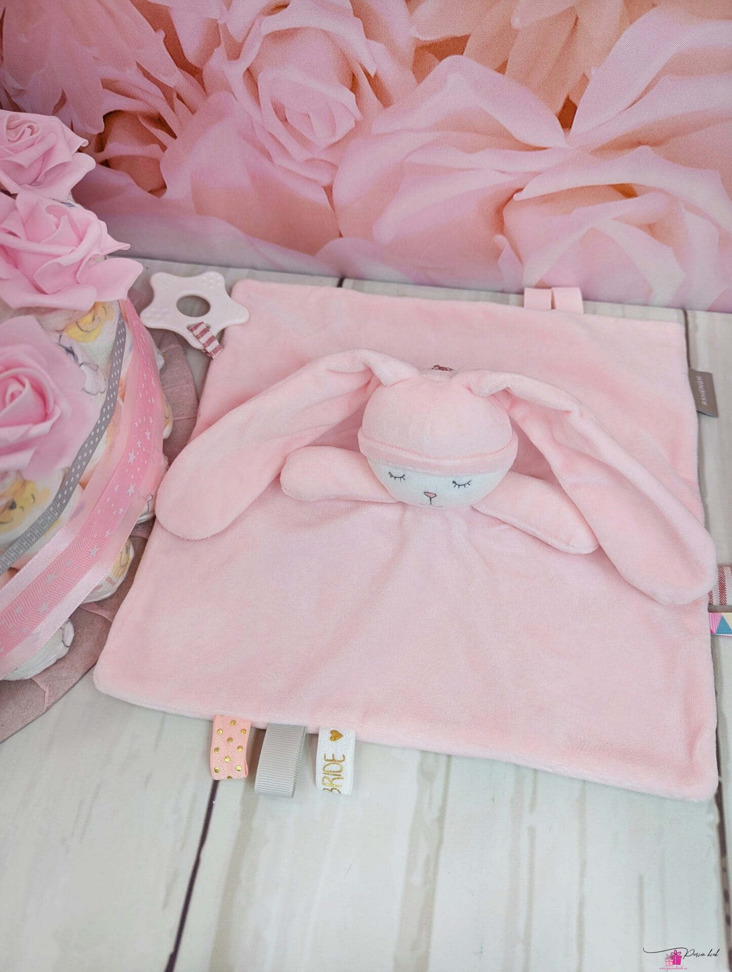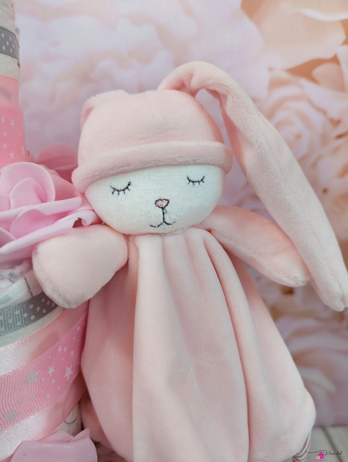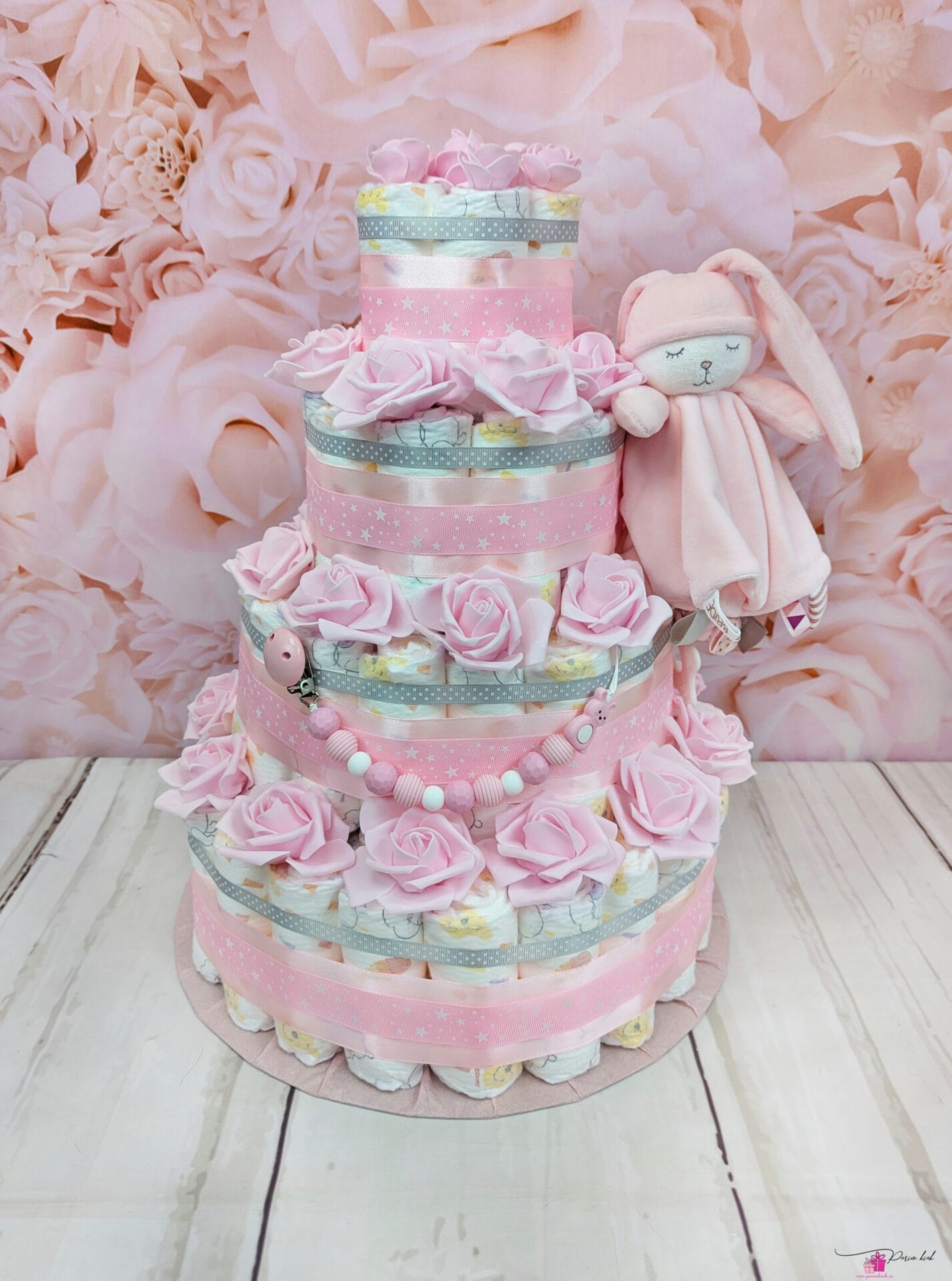 Mähkmetort on valmistatud 103-st mähkmest, pakitud tsellofaani ning kaunistatud suure rosetiga.