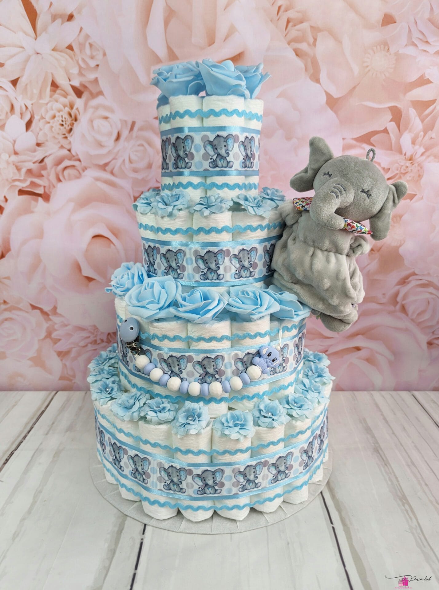 See mähkmetort on HIIGLANE! Ausalt, sõna otseses mõttes! Tegu on neljakordse mähkmetordiga, mis sisaldab 103 mähet meie tavapärase 55 mähkme asemel, lisaks lutiketti ja nunnut elevandi kaisutekki! Meie kolmekordsed tordid on juba suured, see neljakordne mähkmetort on paks nagu Paks Margareeta ja kõrge nagu Vabadussõja võidusammas!