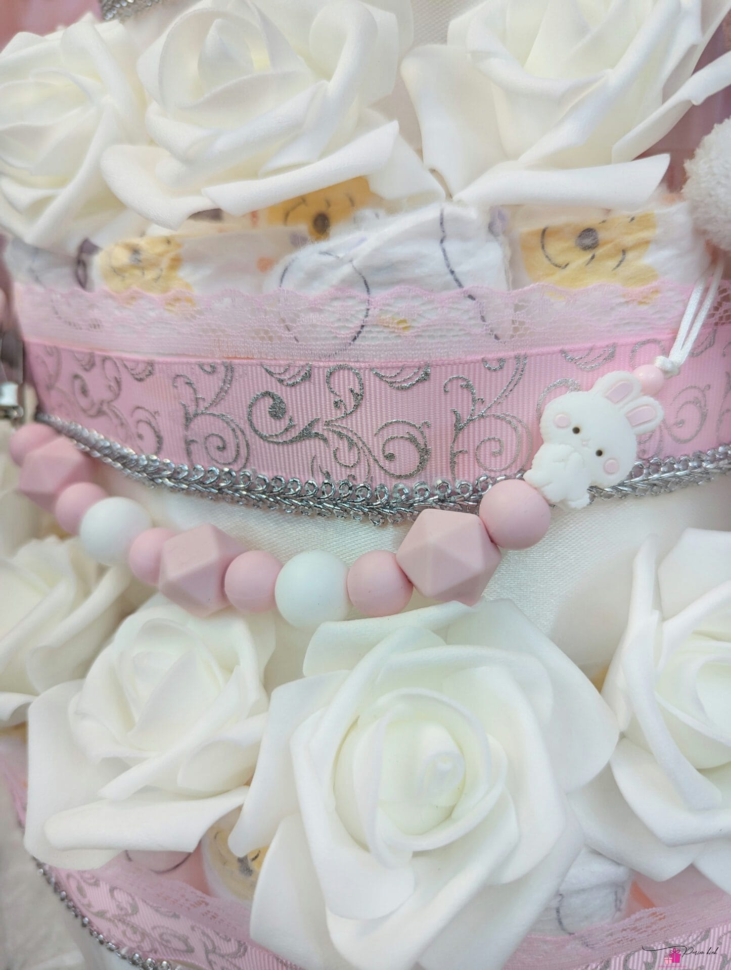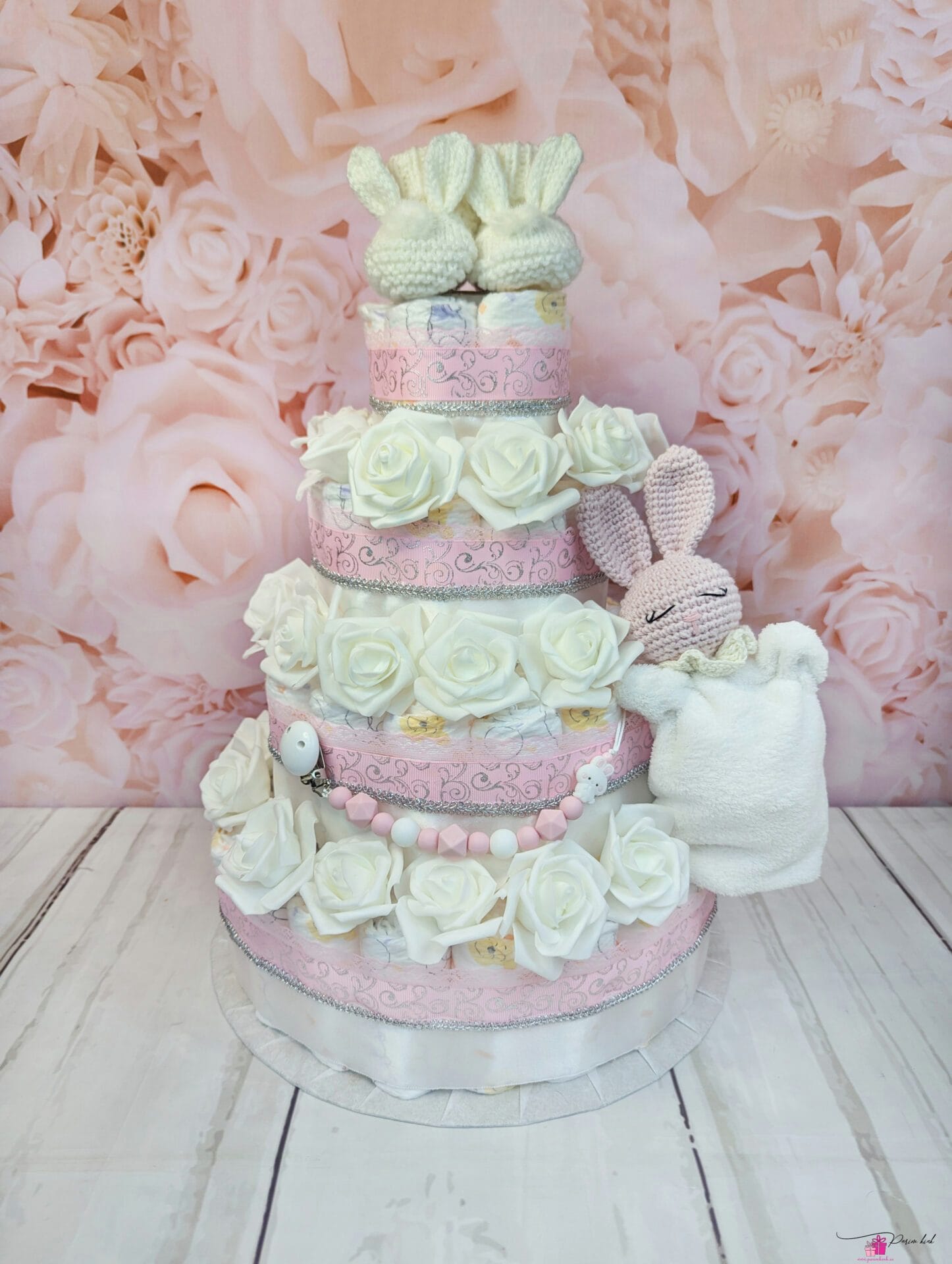 See mähkmetort on HIIGLANE! Ausalt, sõna otseses mõttes! Tegu on neljakordse mähkmetordiga, mis sisaldab 103 mähet meie tavapärase 55 mähkme asemel. Tort sisaldab lisaks mähkmetele ka lutiketti, mis võib olla soovi korral nimeline. Tordi otsas olev jänku kaisutekk ja jänkupapud on meie enda poolt kösitööna valmistatud.