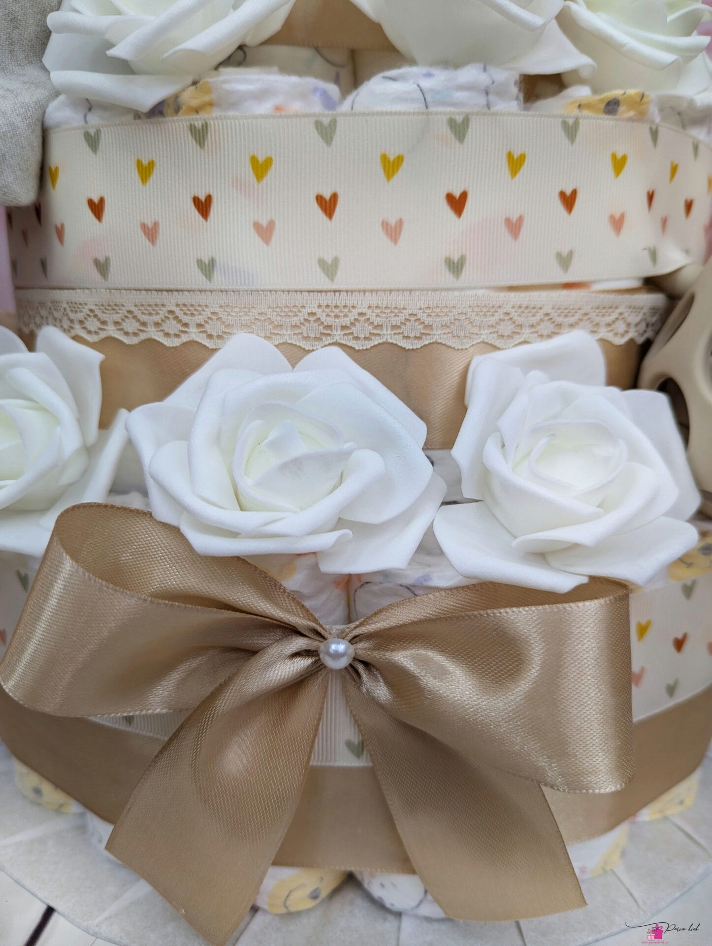 Mähkmetort on valmistatud 103-st mähkmest, pakitud tsellofaani ning kaunistatud suure rosetiga.