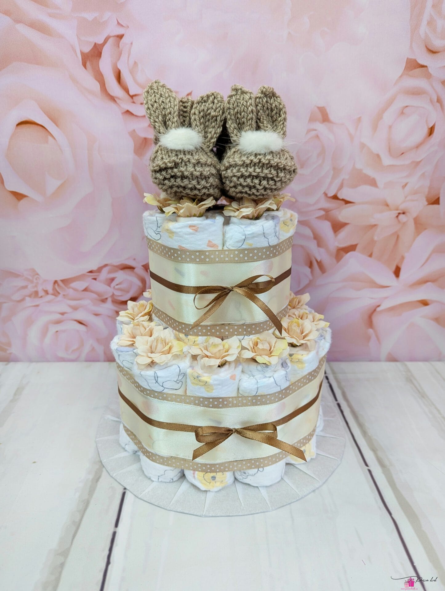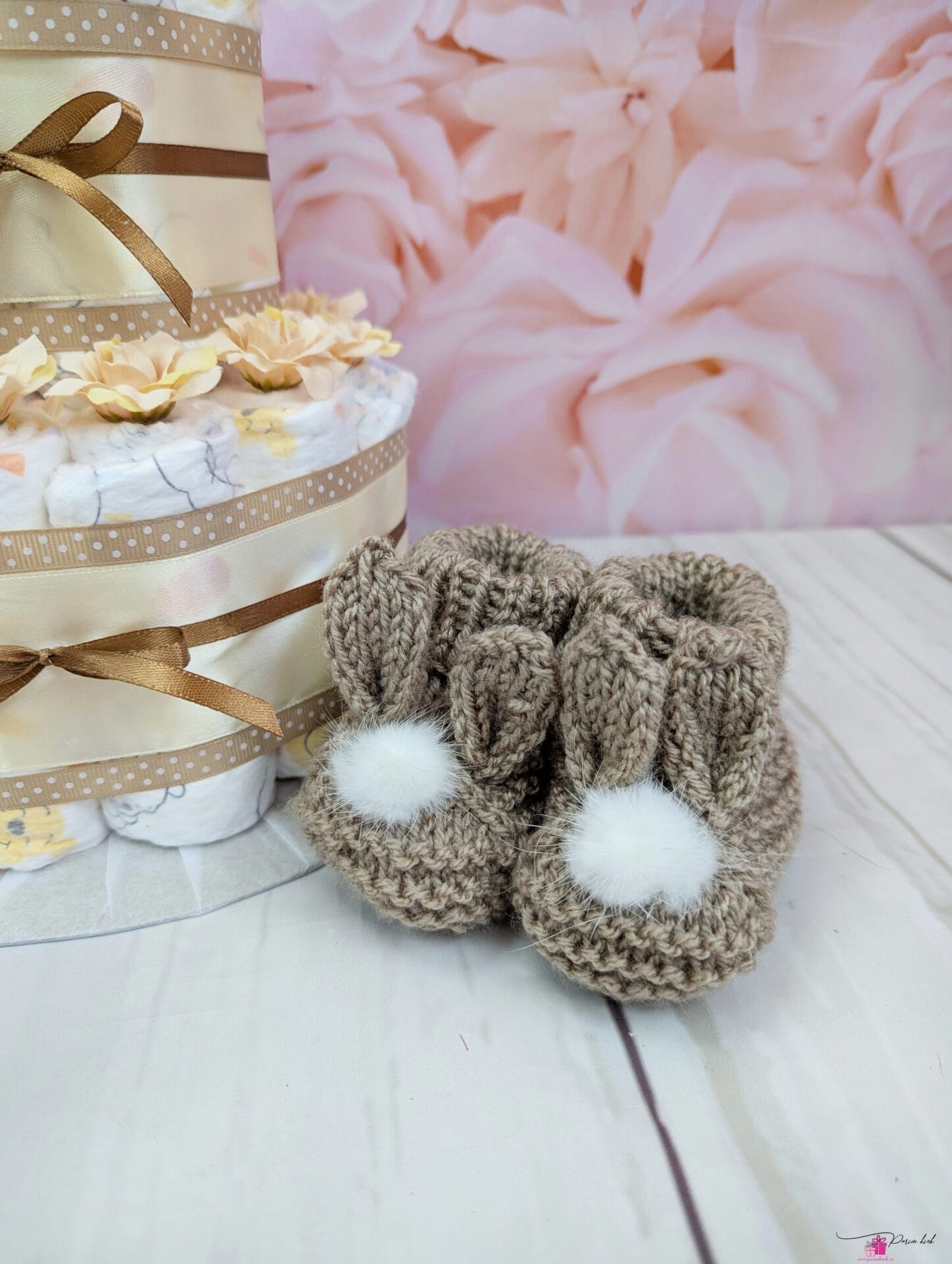 Mähkmetort mille otsas on meie enda käsitööna kootud jänkupapud. Papude kinkimine katsikuks on juba väga vana komme. Ja mis saab olla parem kingitus, kui ühendada need 2 – tänapäevane mähketort ja traditsioonilised papud?