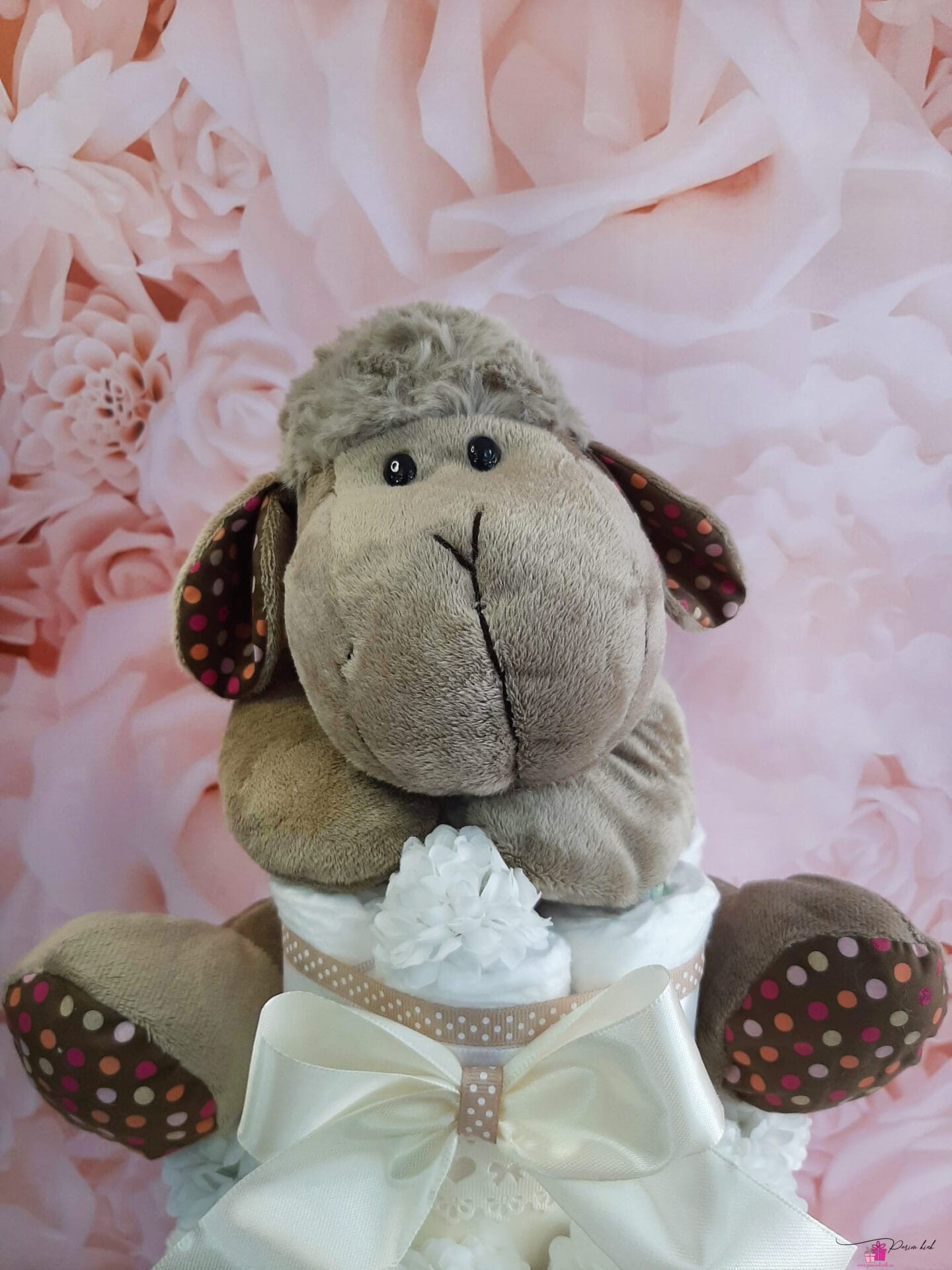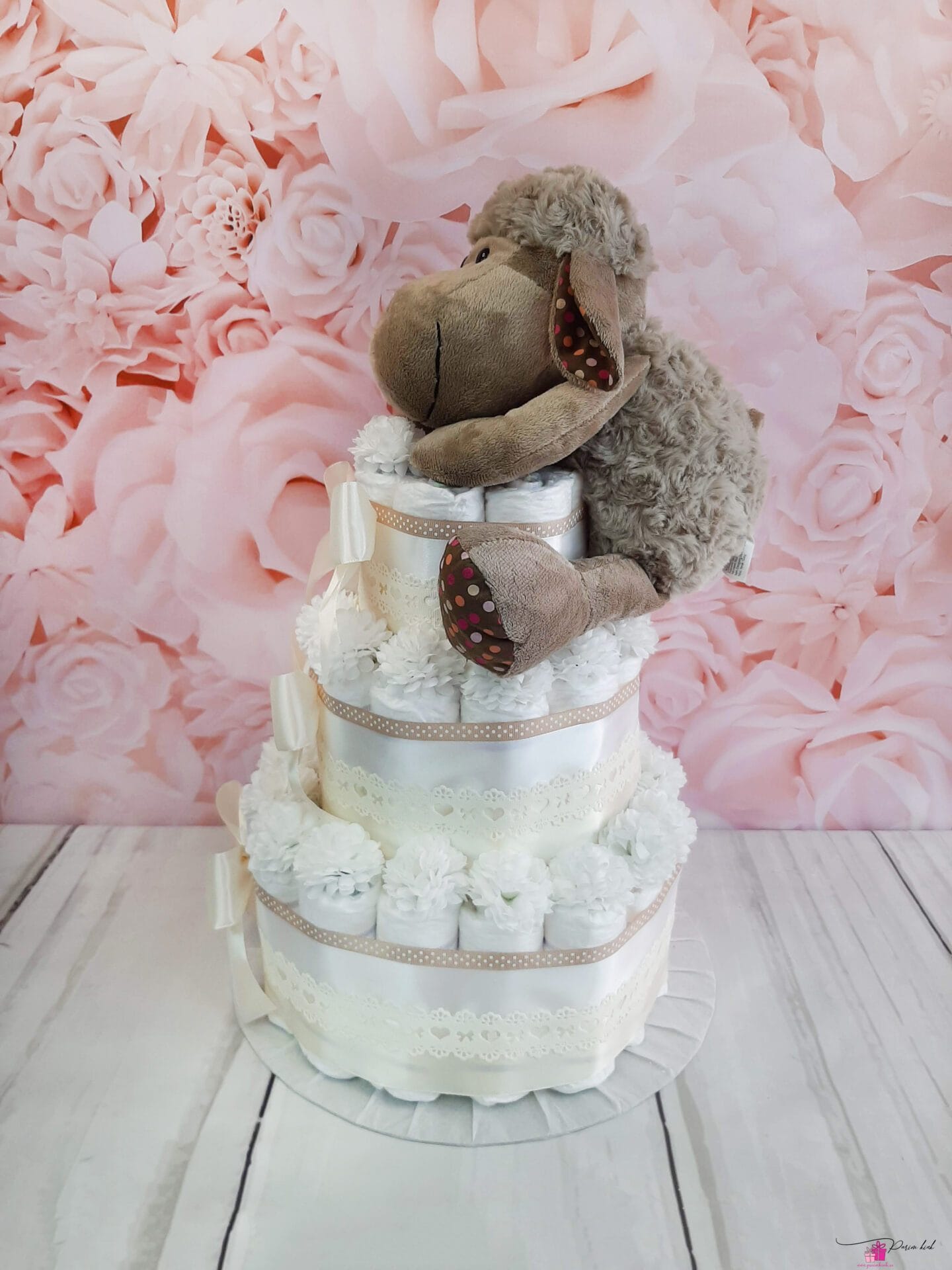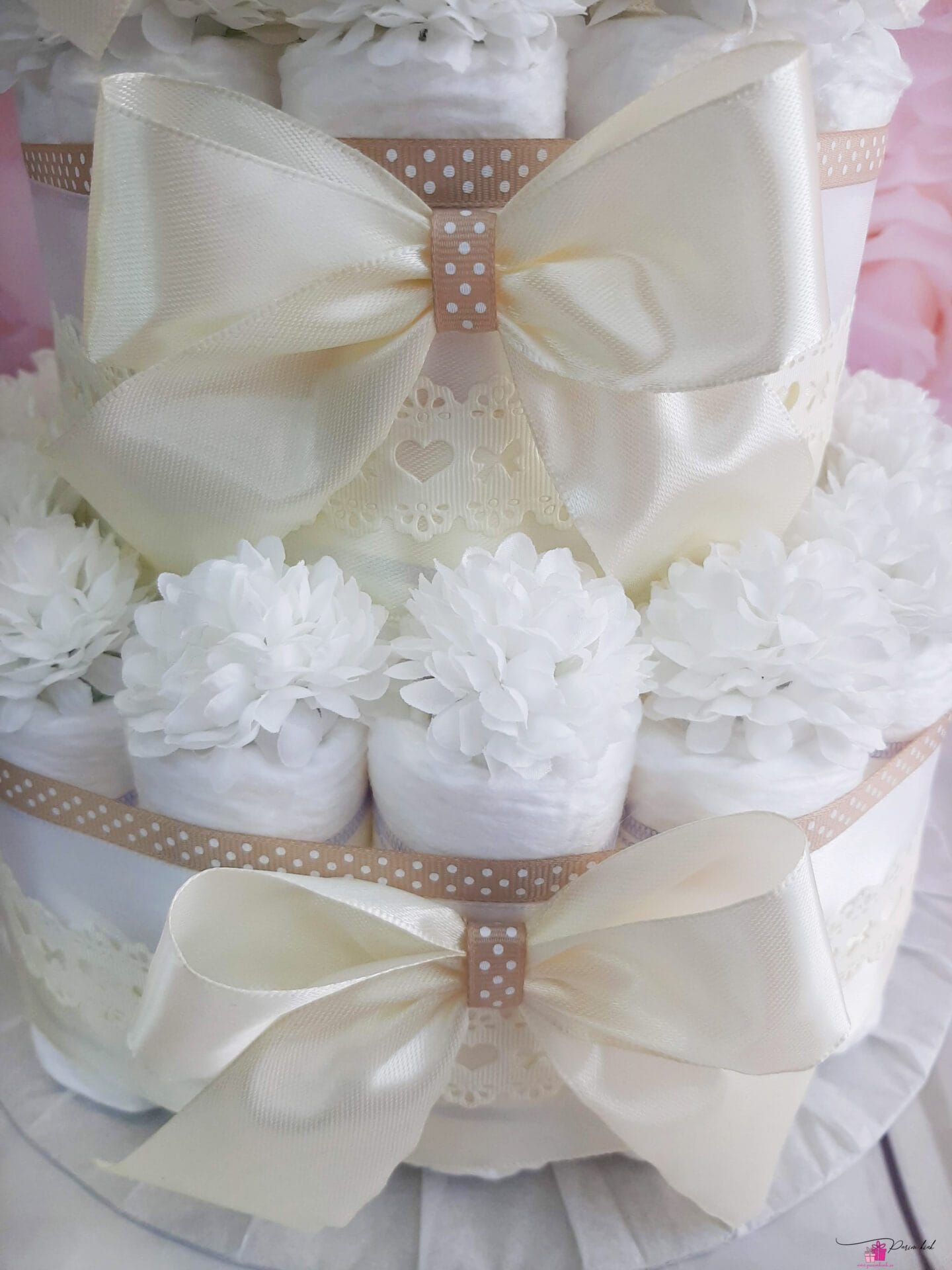 Mähkmetort on valmistatud 55-st mähkmest, pakitud tsellofaani ning kaunistatud suure rosetiga.