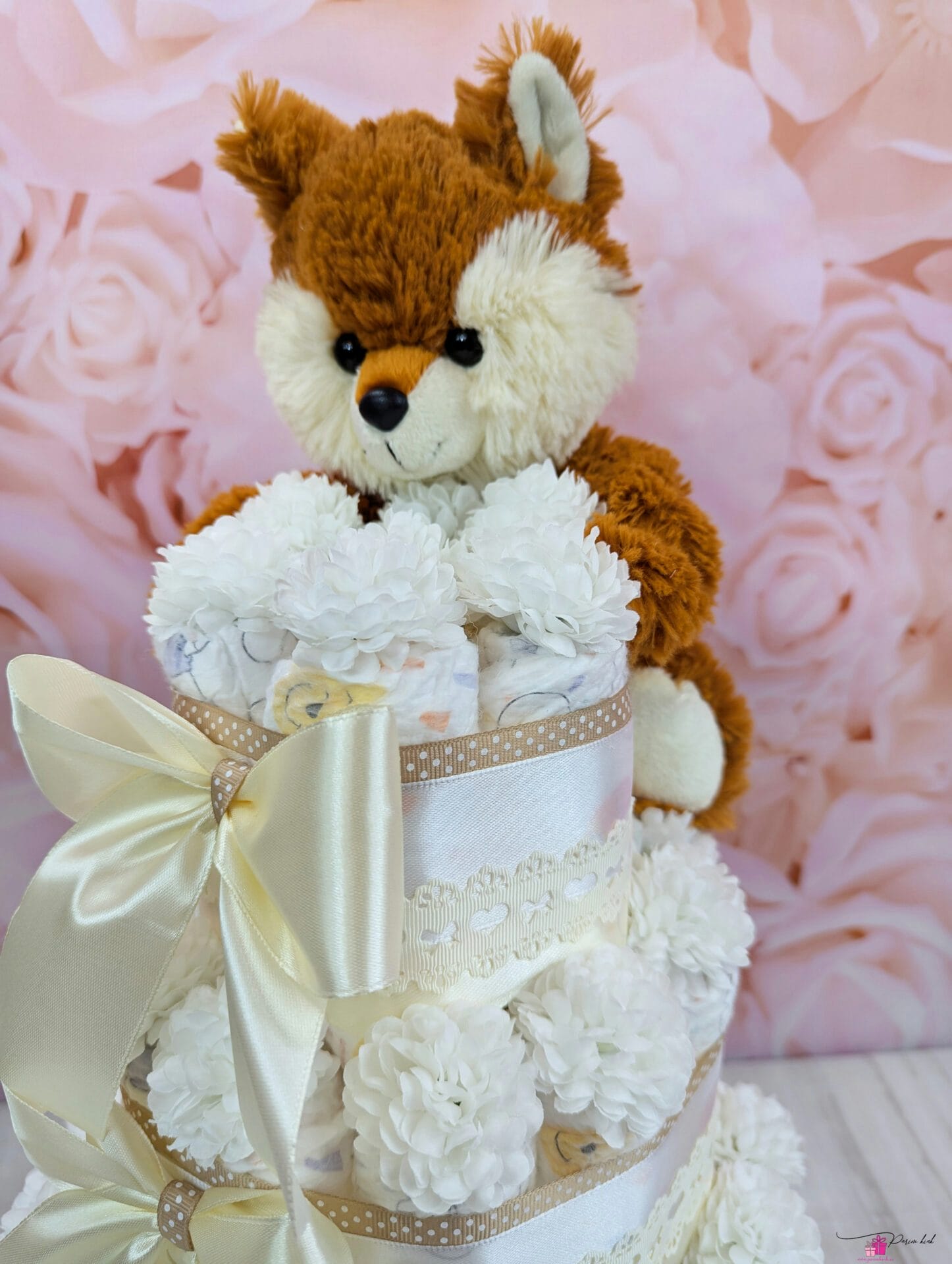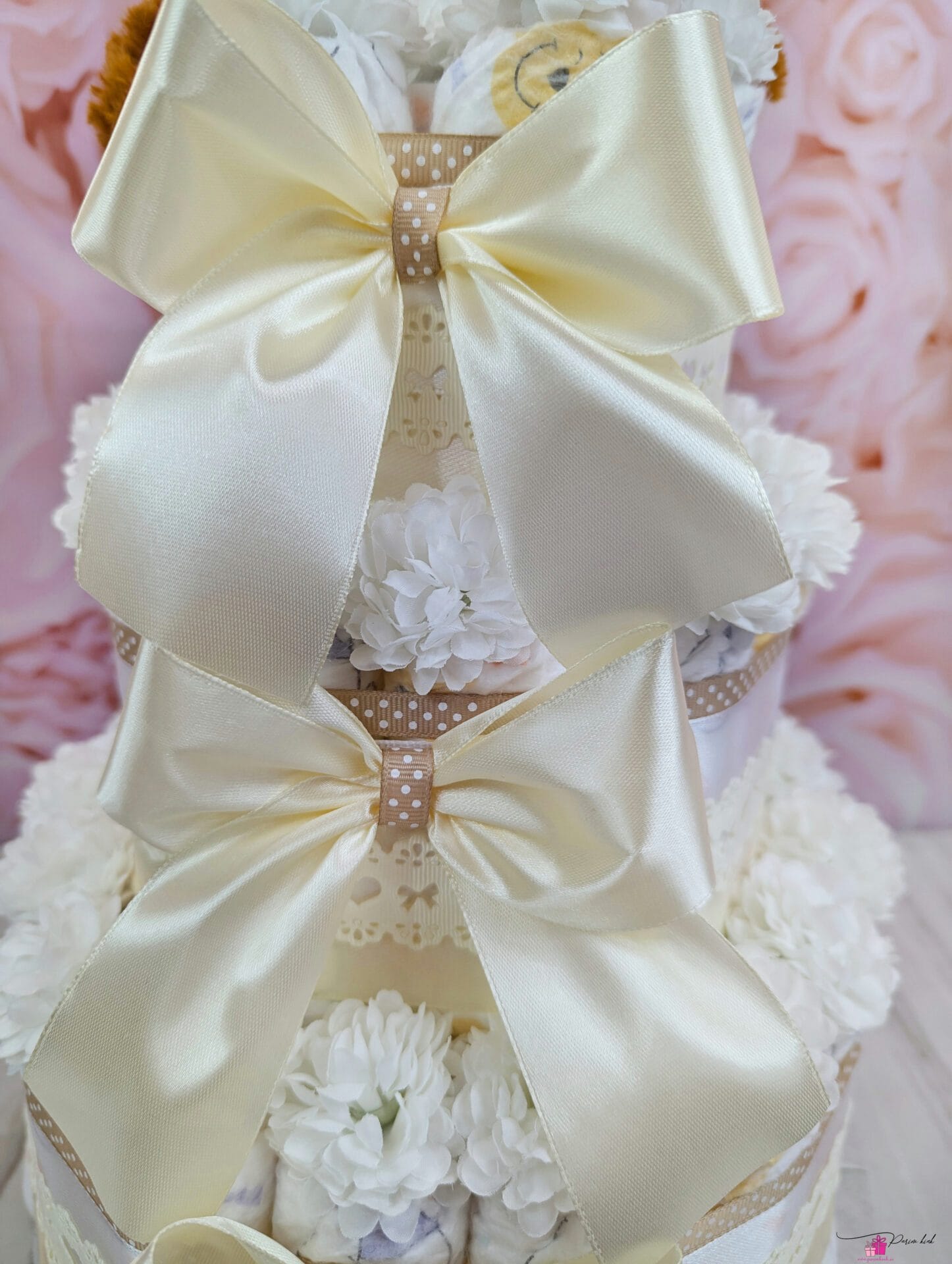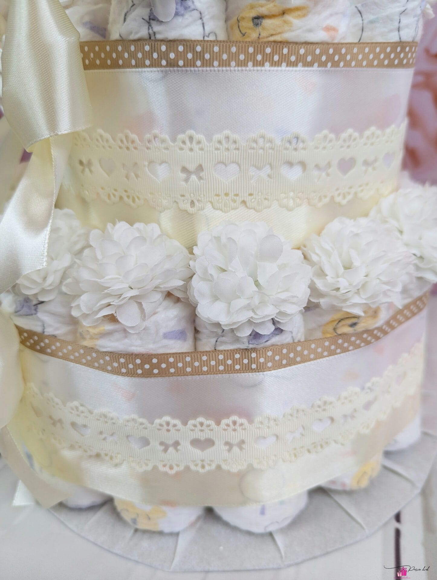 Mähkmetort on valmistatud 55-st mähkmest, pakitud tsellofaani ning kaunistatud suure rosetiga.