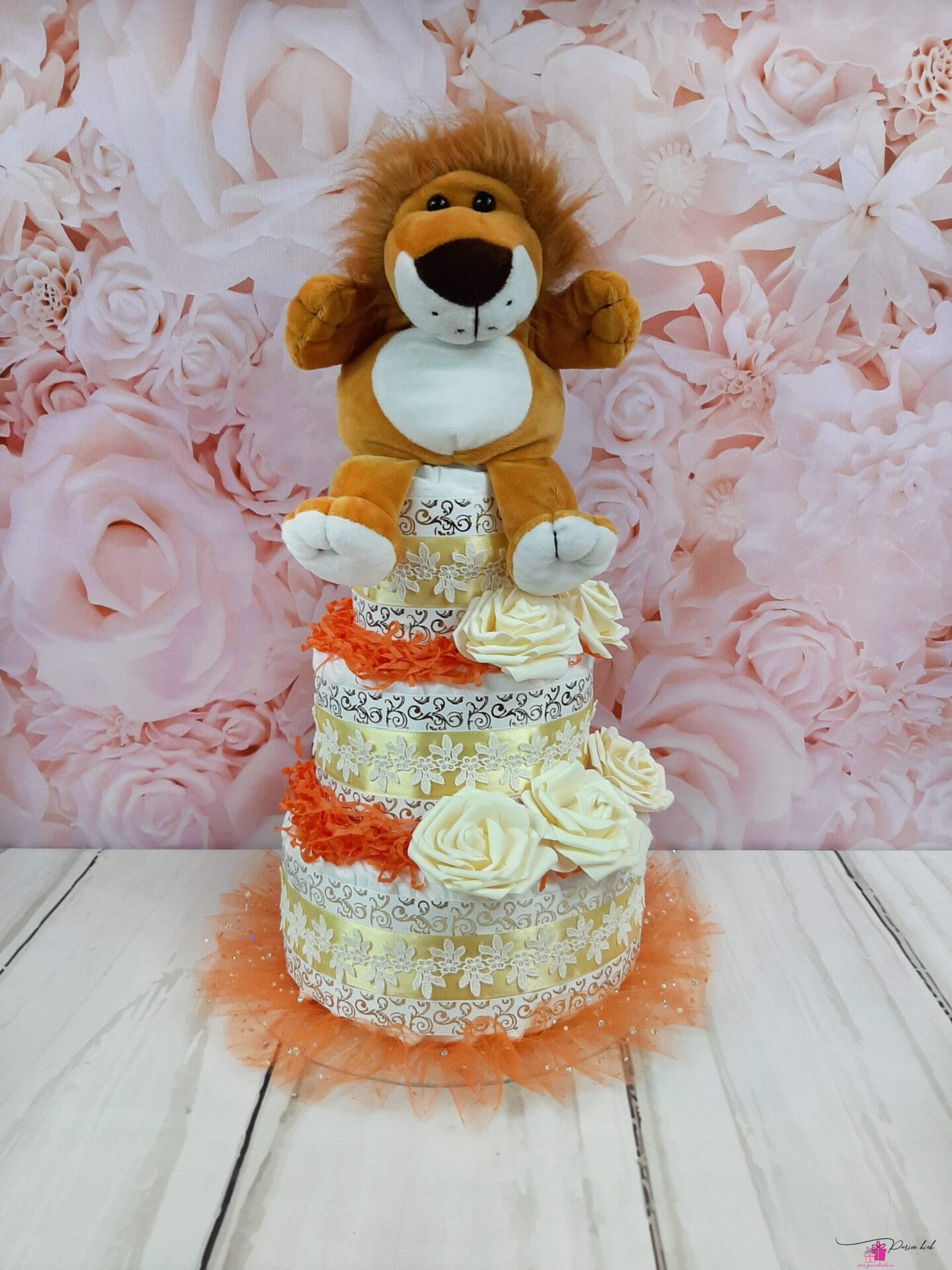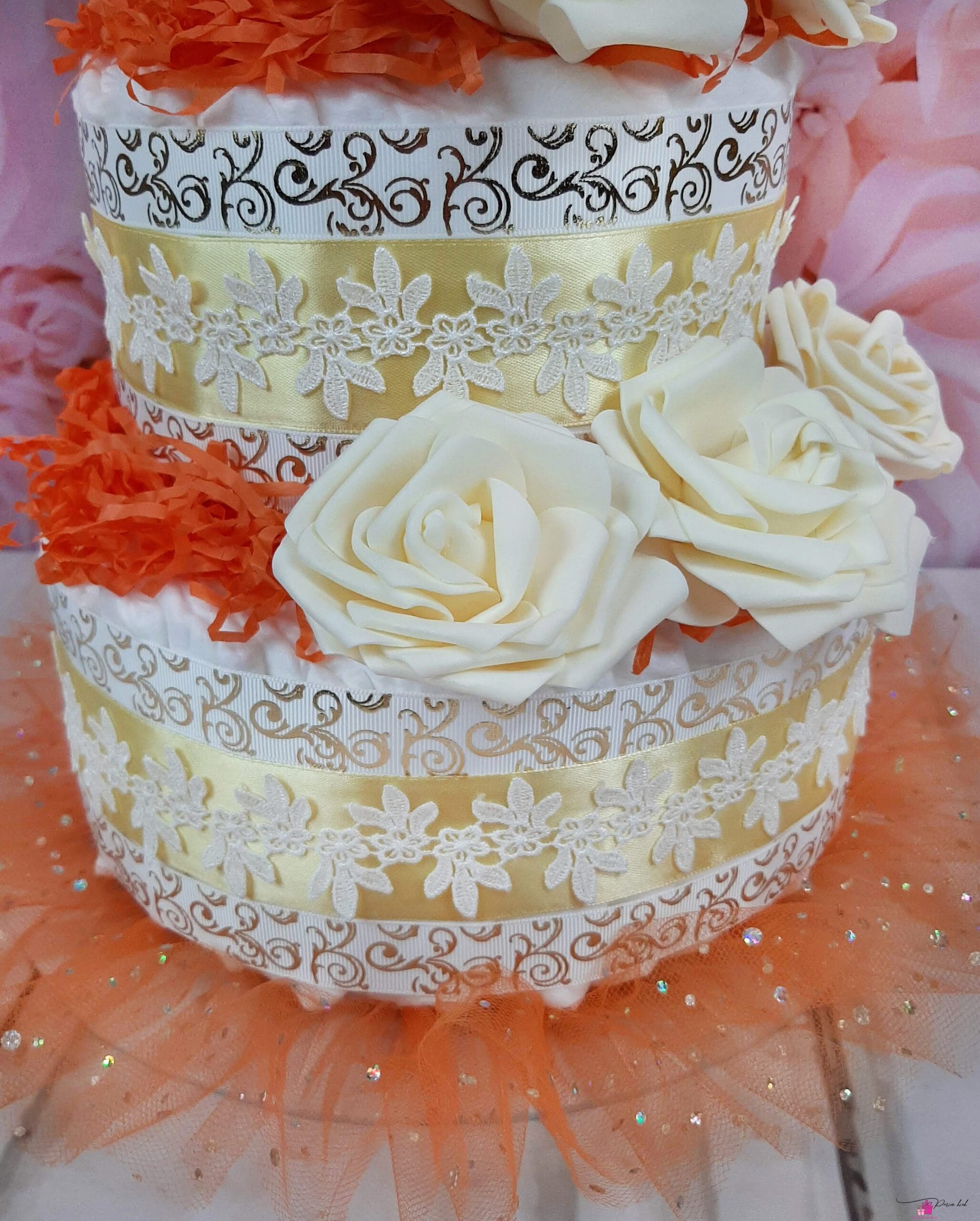 Mähkmetort on valmistatud 55-st mähkmest, pakitud tsellofaani ning kaunistatud suure rosetiga.