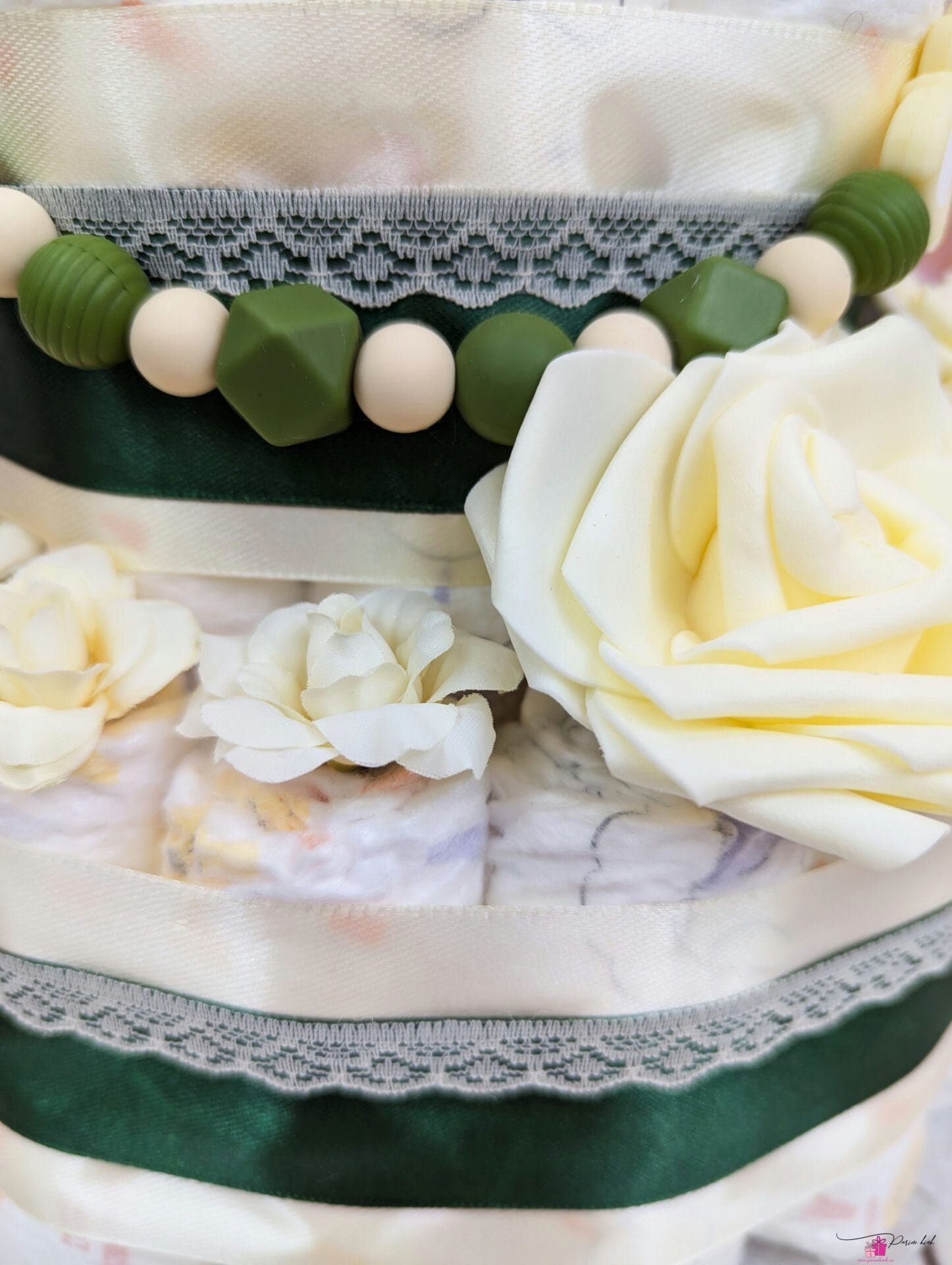 Mähkmetort on valmistatud 55-st mähkmest, pakitud tsellofaani ning kaunistatud suure rosetiga.
